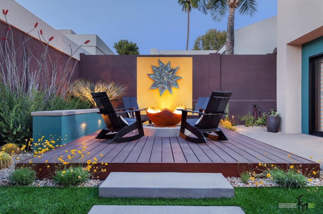 Если площадка на участке оснащена костром, кресла-качалки вокруг него создадут еще более уютную атмосферу.