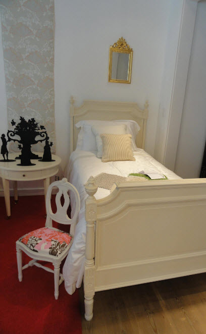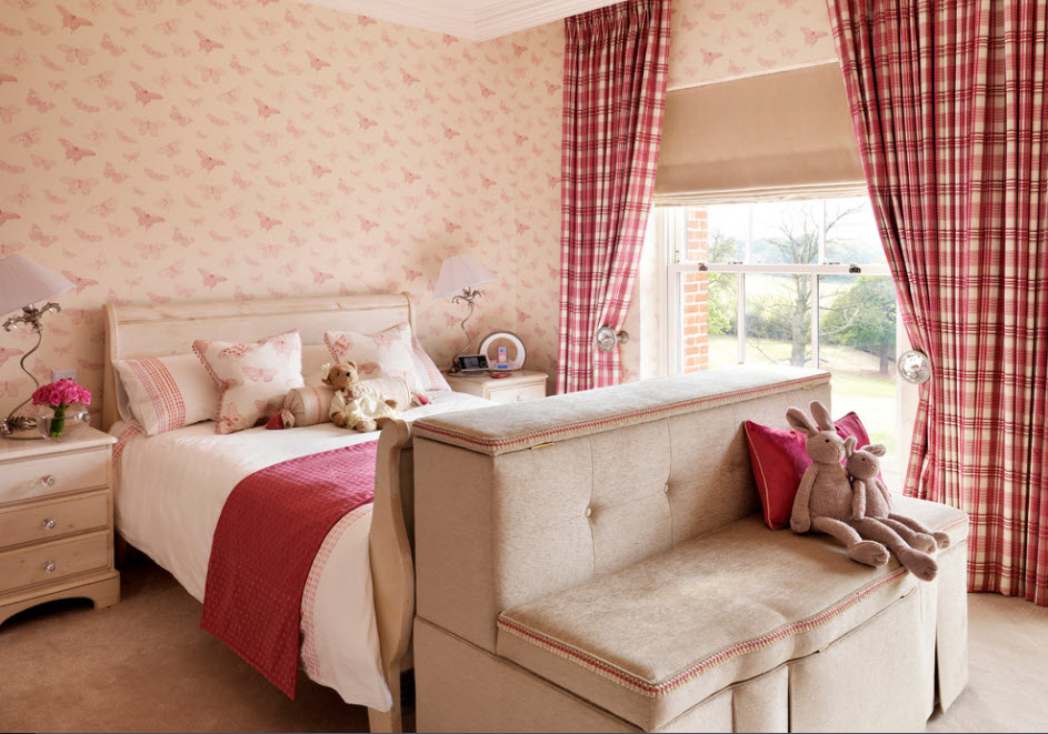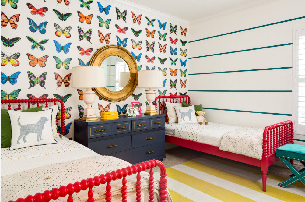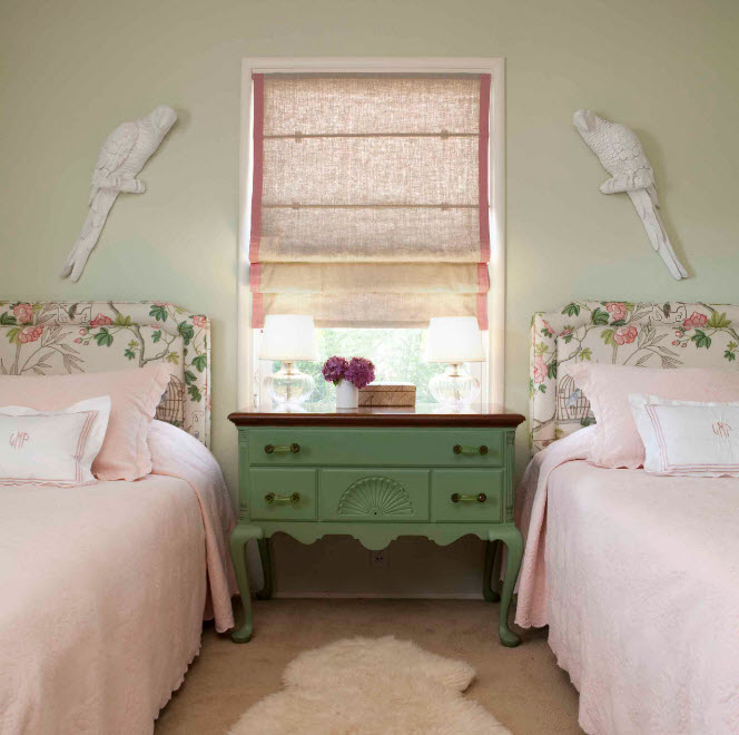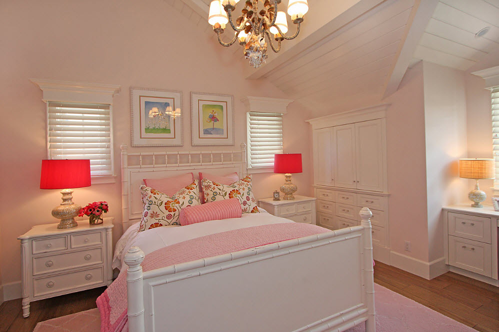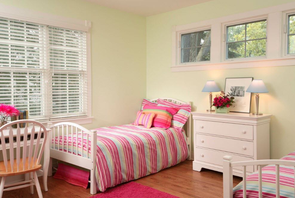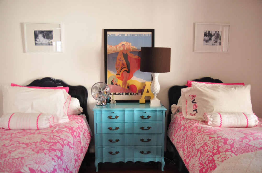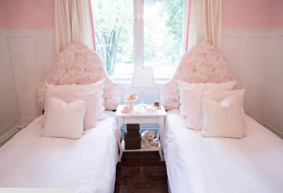 Даже в небольшой, узкой комнате можно расположить две кровати, придвинув каждую из них к стене. При такой планировке в узкой и длинной комнате остается место между кроватями только для одной тумбы или небольшого комода. В случае, если нет возможности оборудовать подставку двумя настольными лампами или торшерами, можно использовать настенные бра. Так вы сможете не только зонировать место для каждой девочки, но и обеспечить обеих возможностью чтения в кровати перед сном.