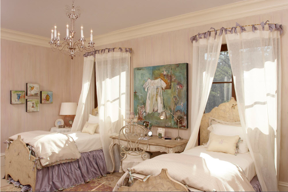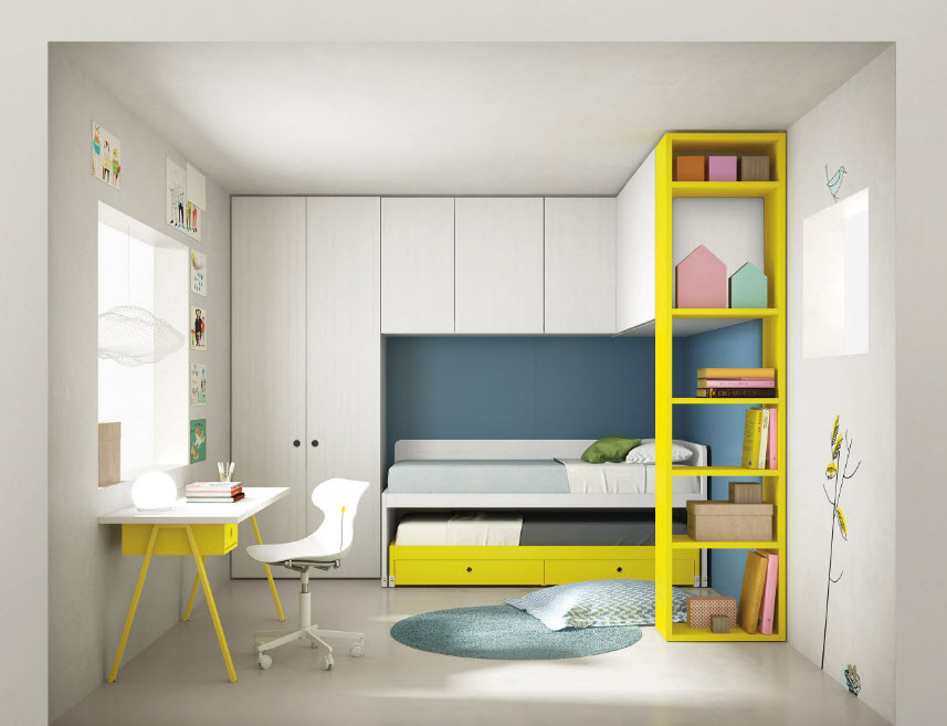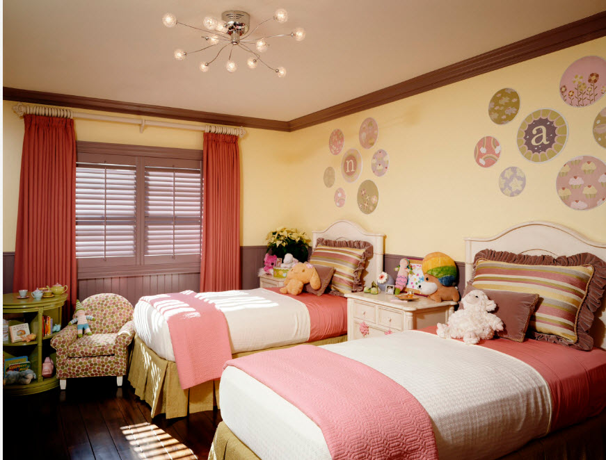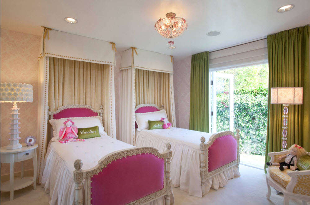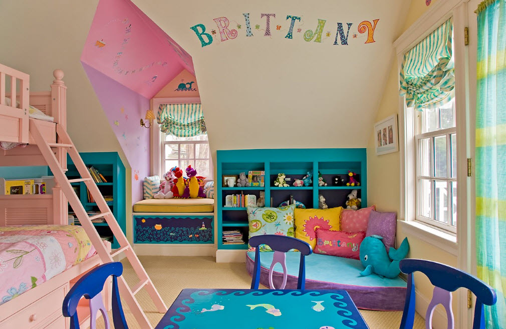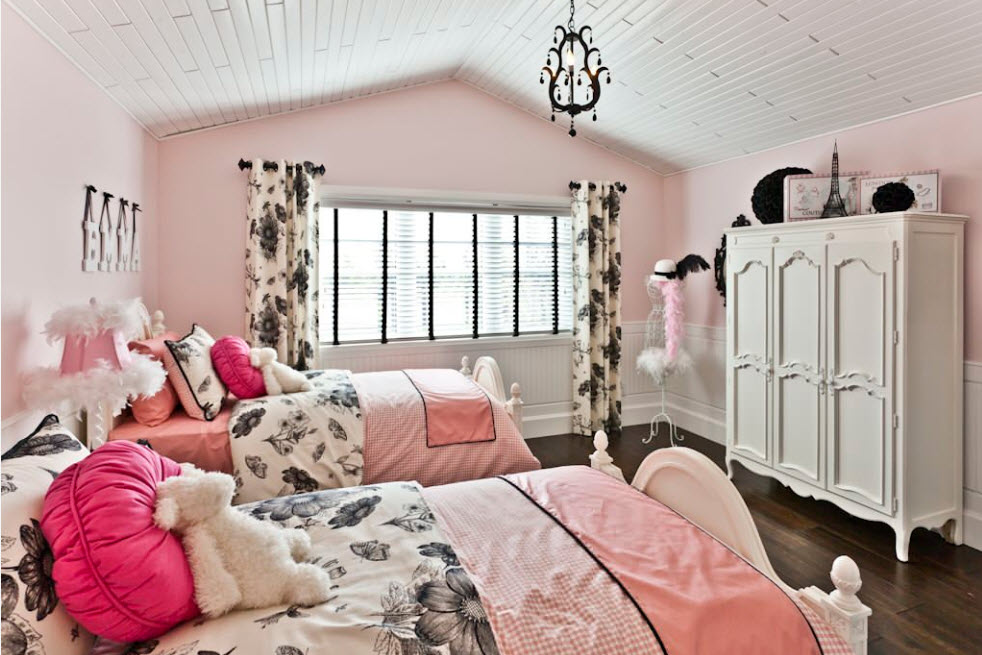 При формировании интерьера комнаты, в которой проживают сестры, одной из важнейших проблем становится рациональное использование пространства. Чаще всего у родителей нет возможности выделить отдельную комнату под спальню, а игровую и учебную зону организовать в другом помещении. И хорошо, если площадь комнаты, в которой девочкам нужно будет спать, учиться, играть и даже принимать подруг, имеет достаточную площадь. Нередко все функциональные зоны приходится размещать в среднем по размерам помещении. В этом случае на помощь приходят двухъярусные конструкции, встроенная мебель и различные трансформеры – выдвижные столешницы, скрытые ящики для хранения, раскладные механизмы.