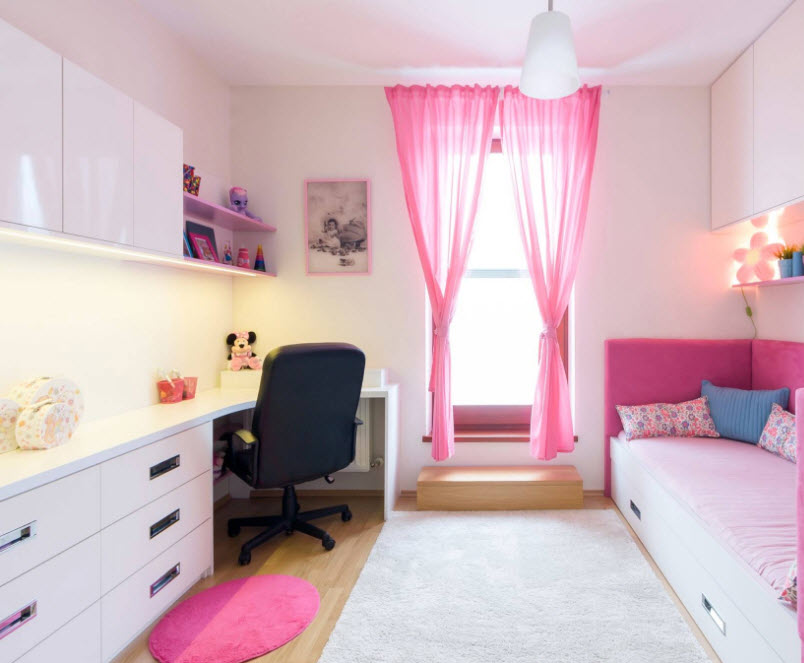 Если при формировании интерьера дошкольницы можно ограничиться лишь консультацией по поводу тематики, цветовой палитры и стилистики исполнения обстановки комнаты, то с девочкой-подростком необходимо находится в непосредственном сотрудничестве при выборе всех элементов дизайна помещения. Очевидно, что в интерьере взрослой девочки будет присутствовать кровать с полноценной длиной, системы хранения для одежды, обуви, аксессуаров, рабочее место с возможностью установки компьютера, полками и ящиками для книг, документов и канцелярии. При формировании дизайна комнаты подростка уже не нужно оставлять свободное пространство для игр, можно установить возле кровати тумбу или стол-подставку, добавить к основным системам хранения комод.