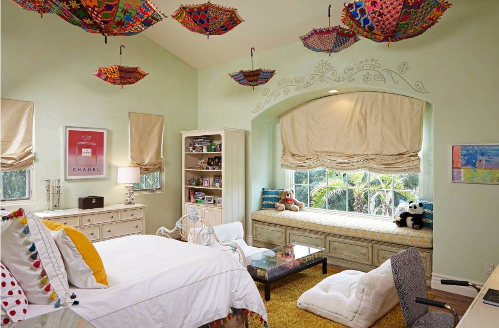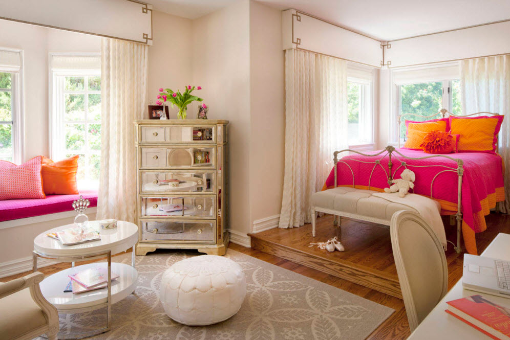 Если площадь детской комнаты позволяет, помимо стандартного набора предметов мебели, можно добавить пару удобных пуфов (с каркасом или бескаркасных). Такие предметы меблировки не занимают много места, мобильны и при необходимости могут быть просто сдвинуты в сторону для освобождения пространства. Зато, если к хозяйке комнаты придут подружки, им будет где разместиться с комфортом.