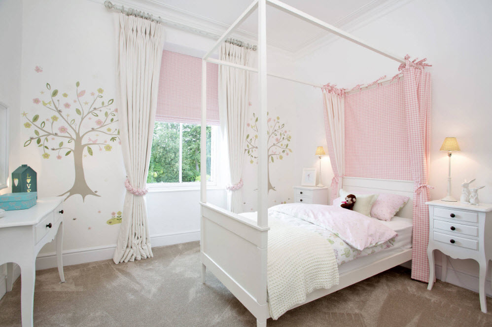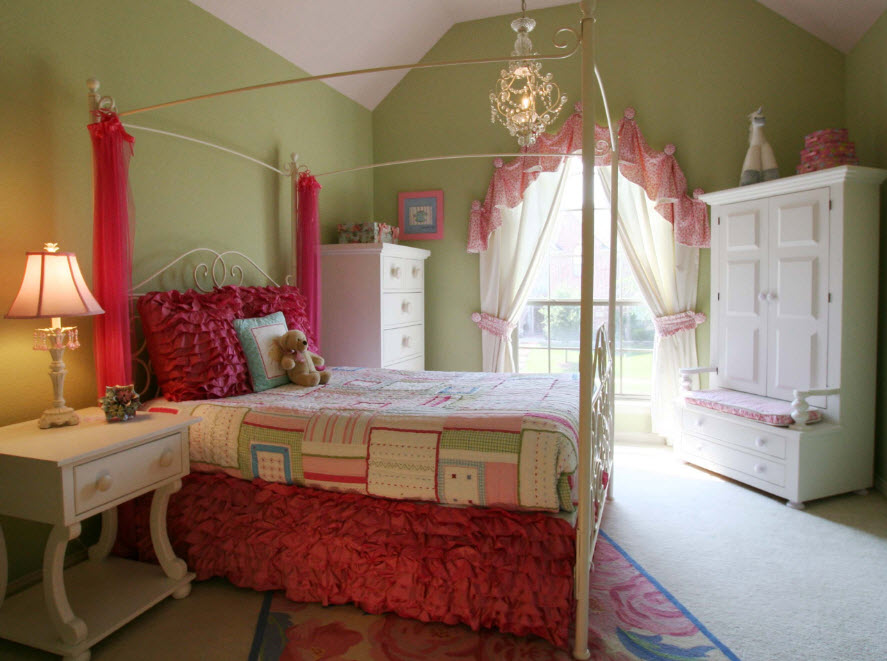 С точки зрения дизайна кровати, вариантов выбора готовых решений масса. Но едва ли найдется девочка, которая не хотела бы почувствовать себя настоящей принцессой. А проще всего создать дворцовую обстановку в детской комнате при помощи кровати с балдахином. Это может быть как полноценный каркас для зашторивания спального места со всех сторон, так и небольшой козырек, позволяющий скрыть лишь небольшую часть кровати от остального пространства за полупрозрачной тканью.