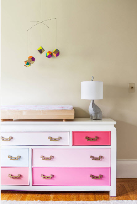 Если в комнате для новорожденной в качестве системы хранения хватало использования одного небольшого комода, то для подрастающей модницы необходимо обзавестись платяным шкафом. При этом комод нужен будет повыше, побольше и с безопасным выдвижением ящиков, ведь ребенок должен иметь возможность сам доставать необходимые предметы гардероба из систем хранения.