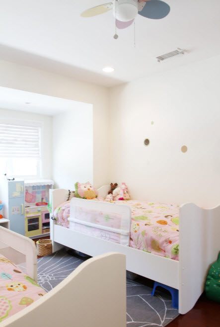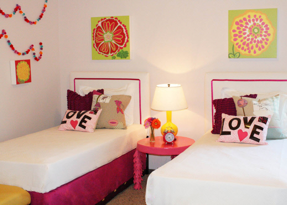 Основной проблемой обустройства комнаты для двоих является расположение спальных мест и если двухъярусные конструкции вас не привлекают или не подходят девочкам из-за большой разницы в возрасте, то необходимо будет решить как расположить две кровати в общей комнате. Планировка спальных мест будет зависеть от размеров комнаты, расположения (и количества) оконных и дверных проемов. На самом деле, вариантов всего два – параллельное и перпендикулярное размещение кроватей относительно друг друга.