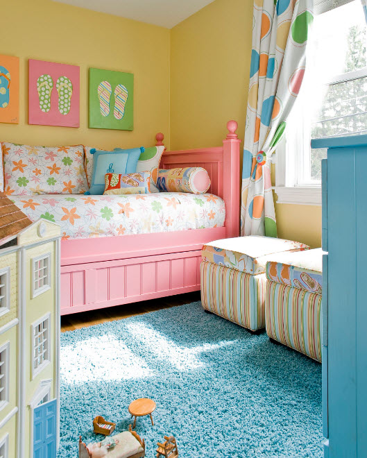 Если говорить о выборе палитры для исполнения кровати, да и остальной меблировки, многое зависит от цветовых решений, принятых для отделки комнаты. Если для стен детской выбрана светлая и даже белоснежная гамма, то мебель лучше приобретать яркого, контрастного цвета. Большинство девочек выбирают розовые и фиолетовые оттенки при любой возможности. Но вариантов масса – сохранить девичий характер комнаты можно и с использованием более активных цветов исполнения меблировки.