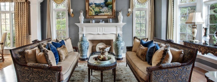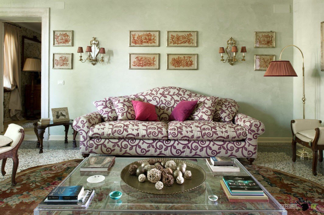 Если в обивке мягкой мебели классического интерьера используется принт, то, как правило – это цветочный, растительный рисунок, но встречаются и геометрические орнаменты. Чтобы не придать интерьеру гостиной излишней пестроты, в комнатах с принтованной обивкой мебели стараются избегать рисунка на обоях, ковровых покрытиях и шторах.