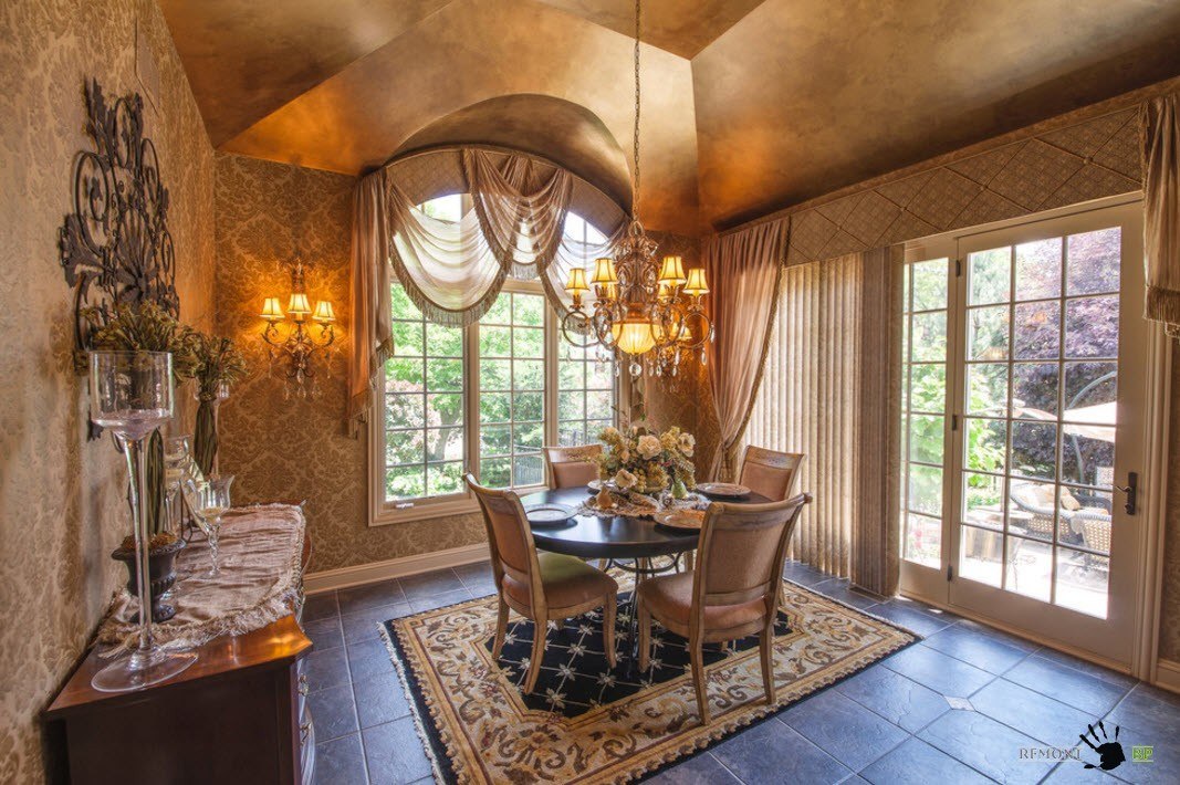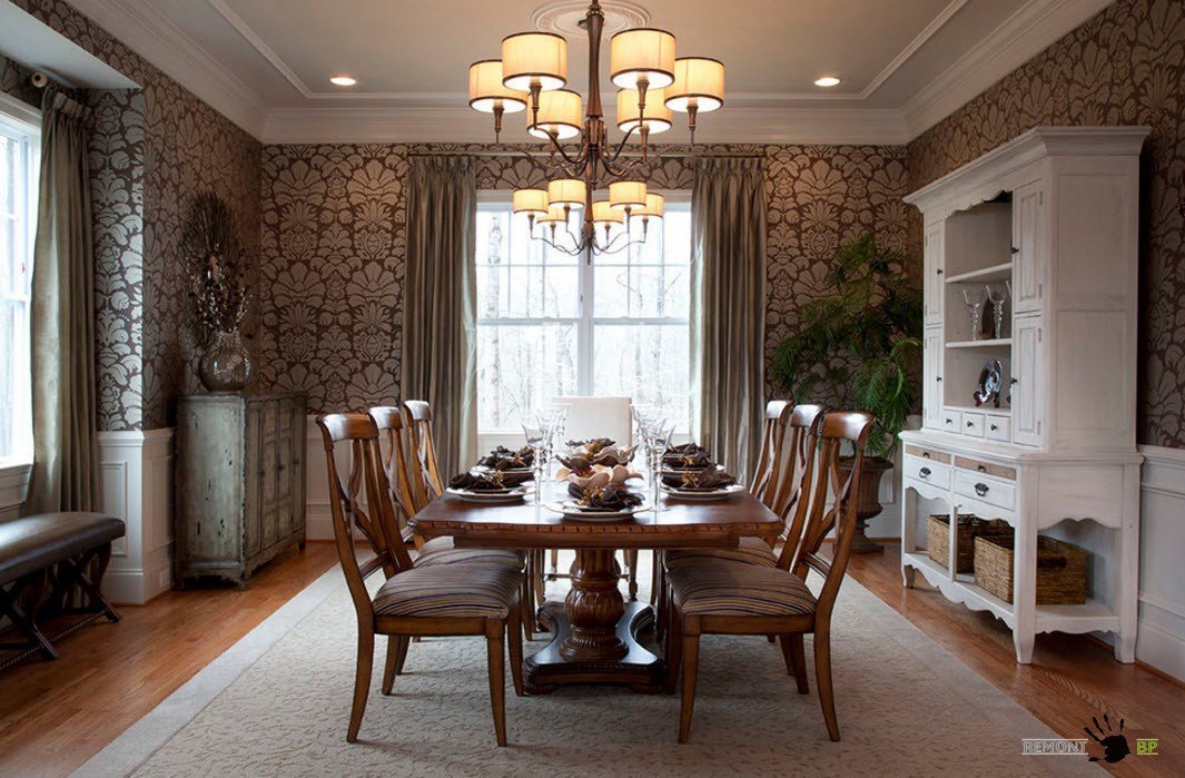 Роскошный обеденный стол на резных ножках и с лакированной столешницей способен стать фокусным центром любой столовой в классическом стиле. Достойную компанию ему составят стулья с деревянными каркасами и мягкой обивкой сидений и спинок. Расцветка и принт обивки могут быть самыми разнообразными. Часто в классических интерьерах можно встретить использование одной ткани для оформления окон и обивки стульев или мини-кресел.
