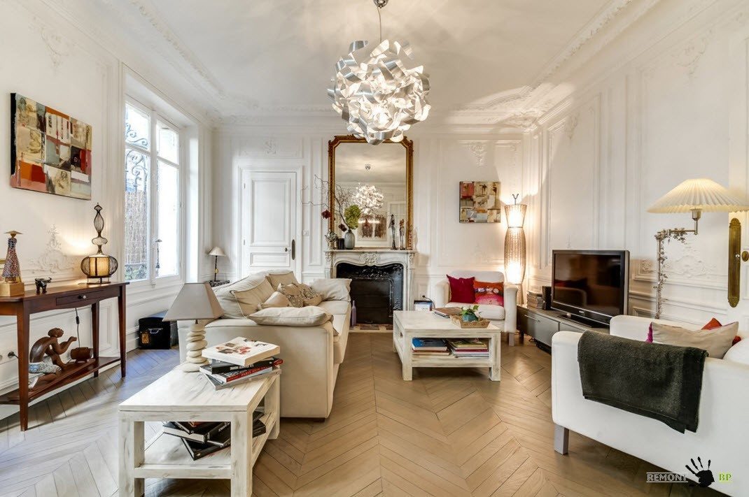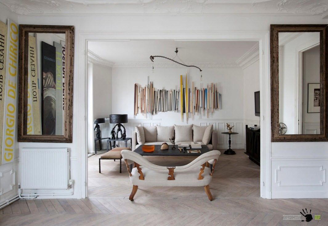 В неоклассическом интерьере возможно не только использование ультрасовременных моделей осветительных приборов, применение настенного декора в виде произведений современного искусства, но и установка меблировки с потертостями, искусственно состаренными поверхностями.