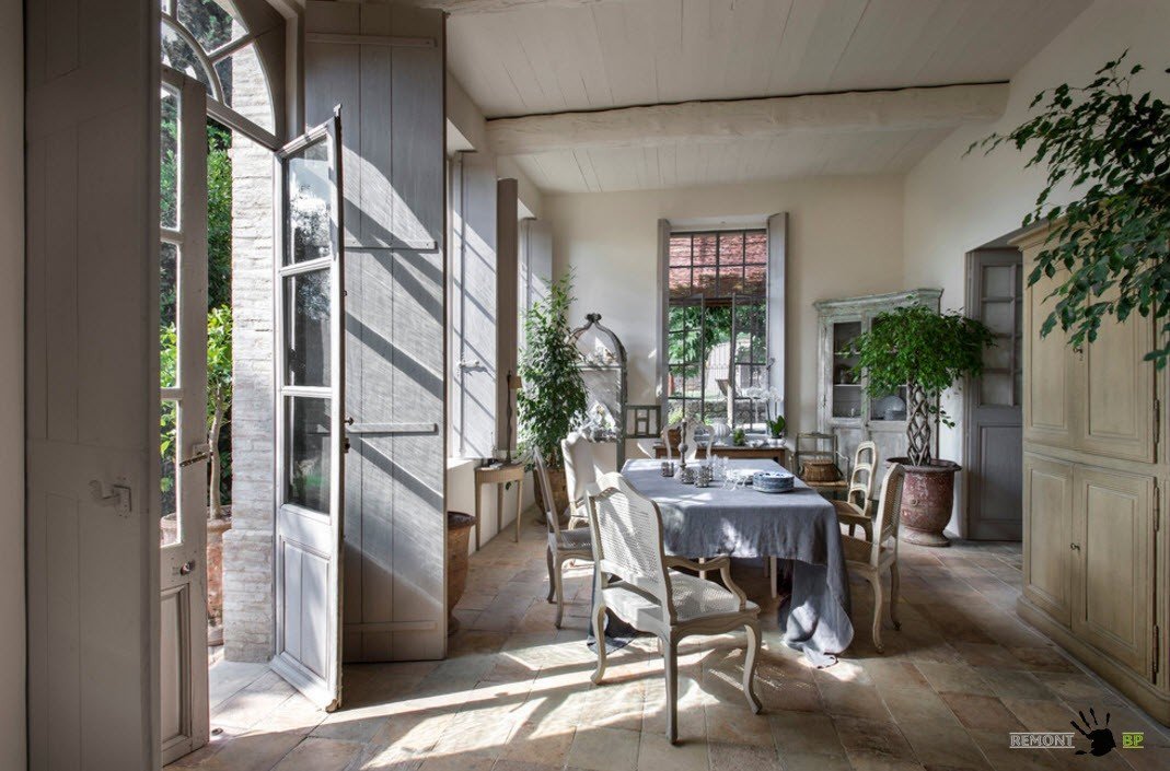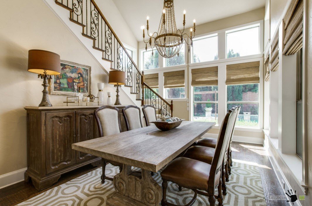Использование древесины светлых пород или окрашивание натурального материала позволяет создать невероятно чистый и даже воздушный образ столовой. Иногда такая меблировка подвергается искусственному состариванию для создания особого шарма помещения, которое хранит семейные традиции уже много поколений.