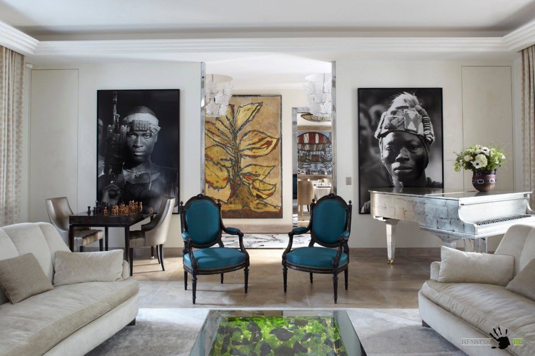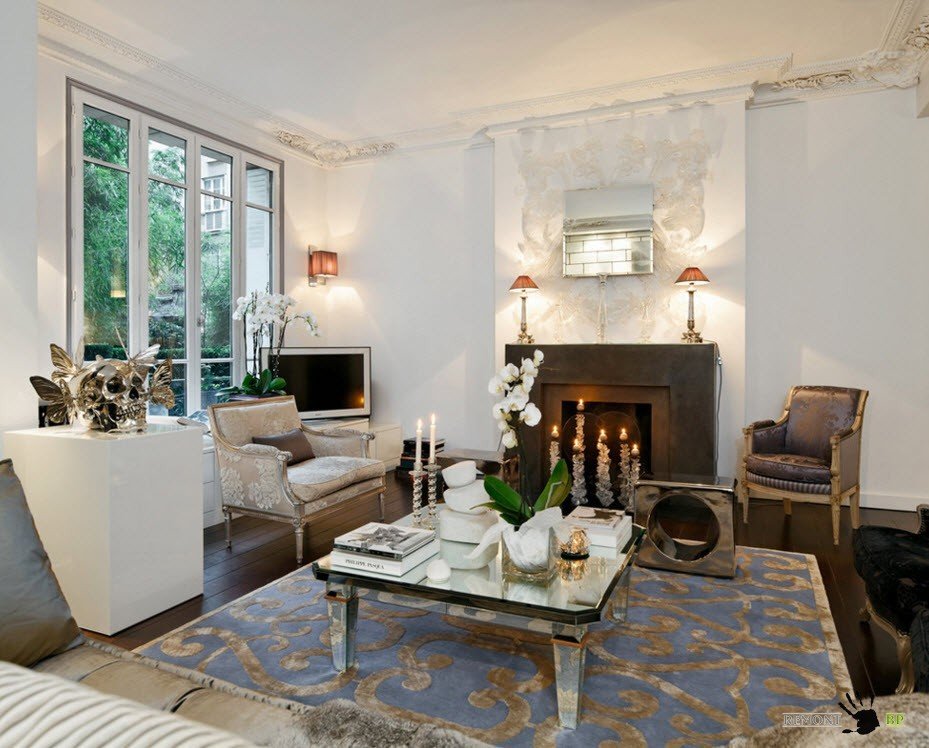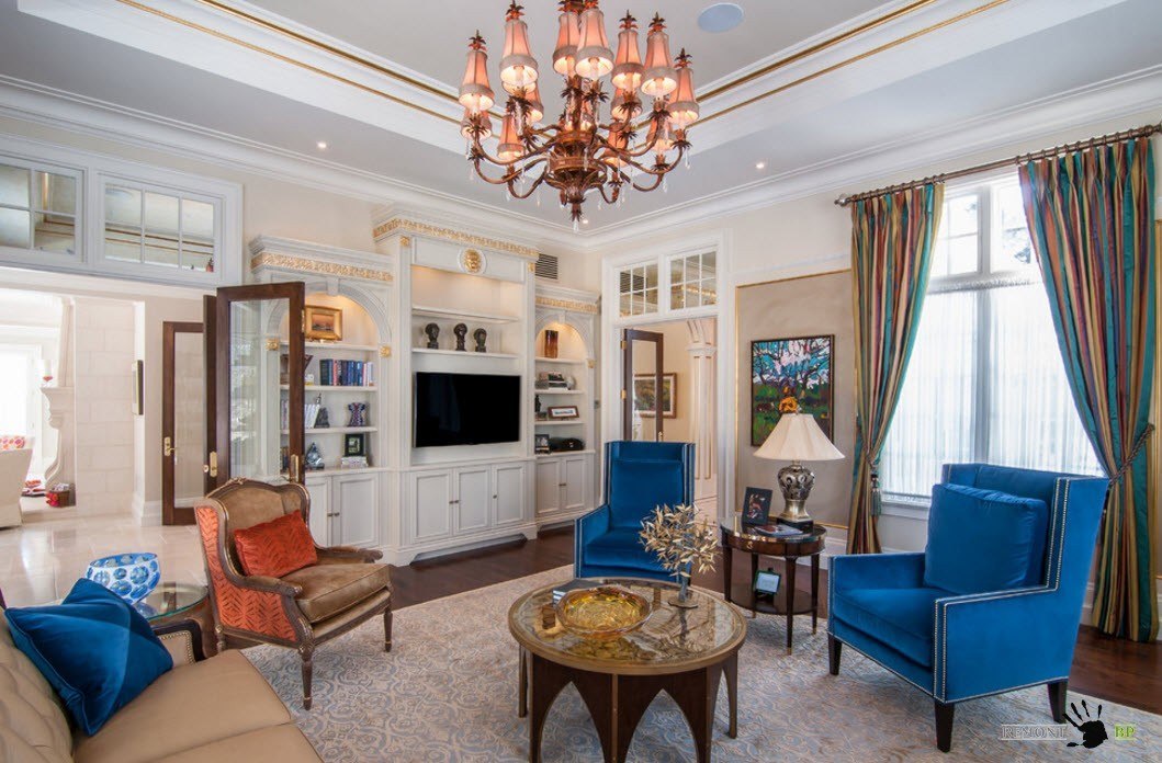 Представить себе классическую гостиную без дивана непросто. Но для создания зоны отдыха в традиционном интерьере можно использовать пары кресел, расположенные симметрично вокруг журнального столика или пуфа, выполняющего роль острова. Кресла в этом случае могут быть как одной модели, так и отличаться конструкцией, цветом и принтом обивки. Главное в процессе подбора меблировки не забыть о правиле симметрии и комбинаторике основных цветов.