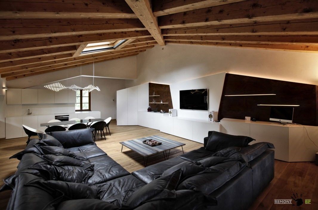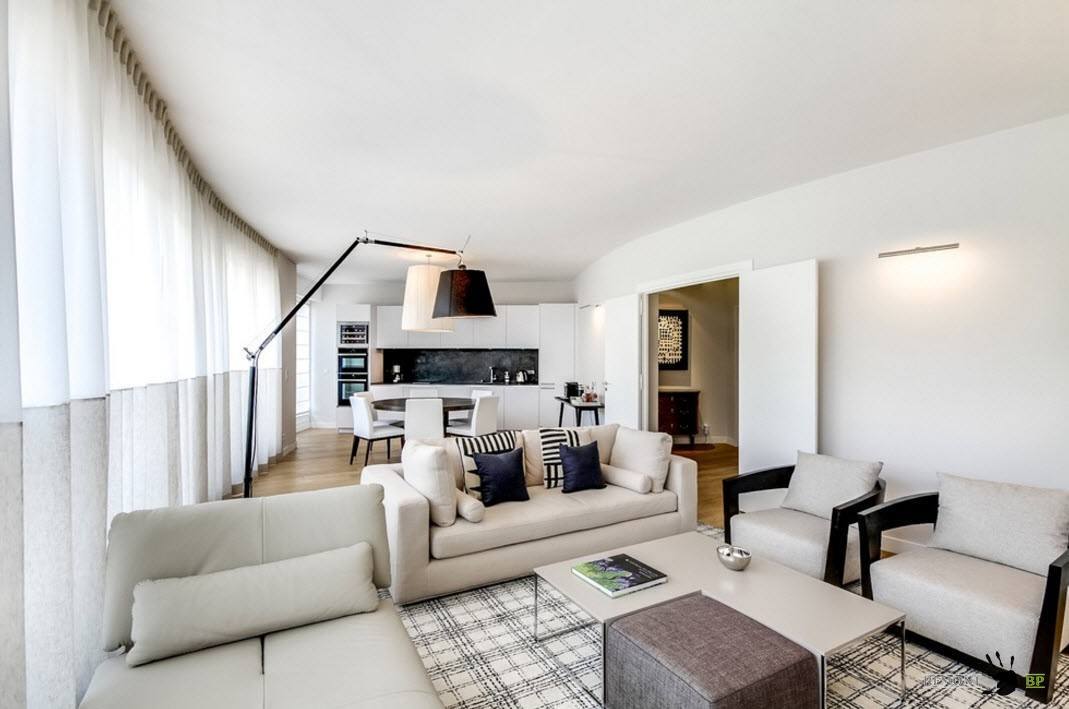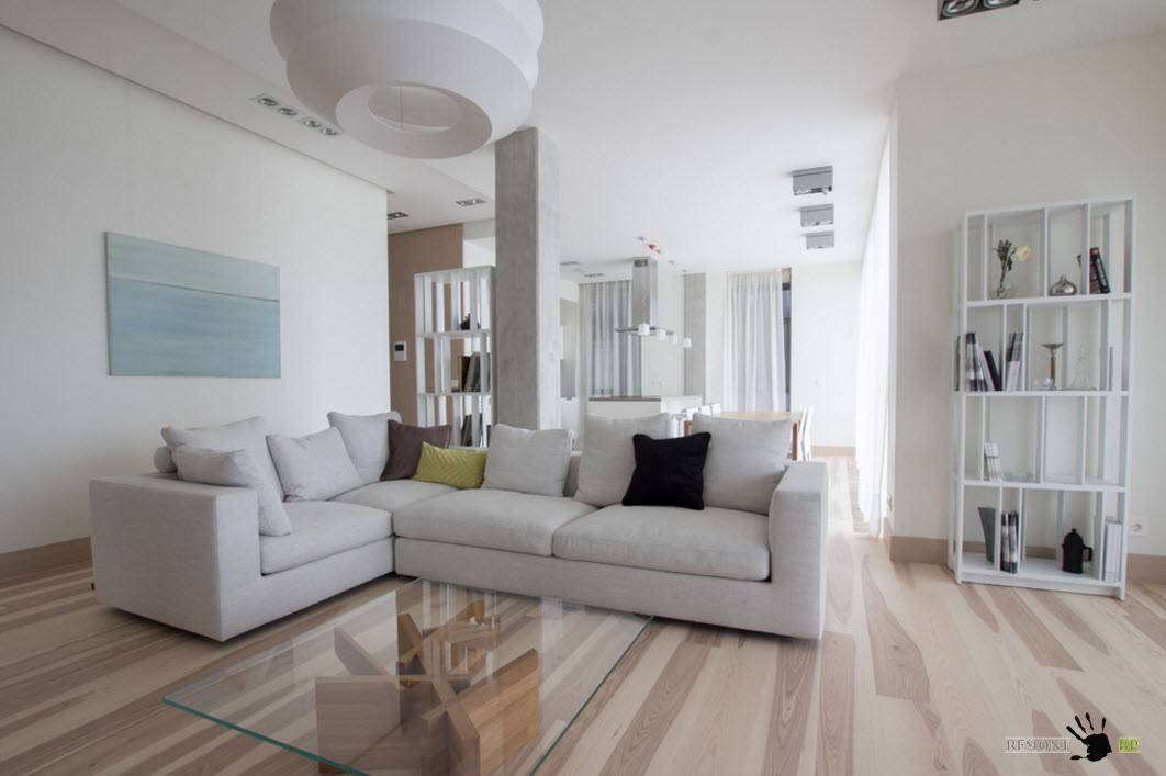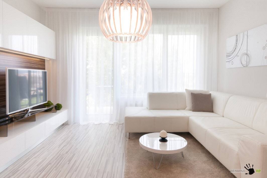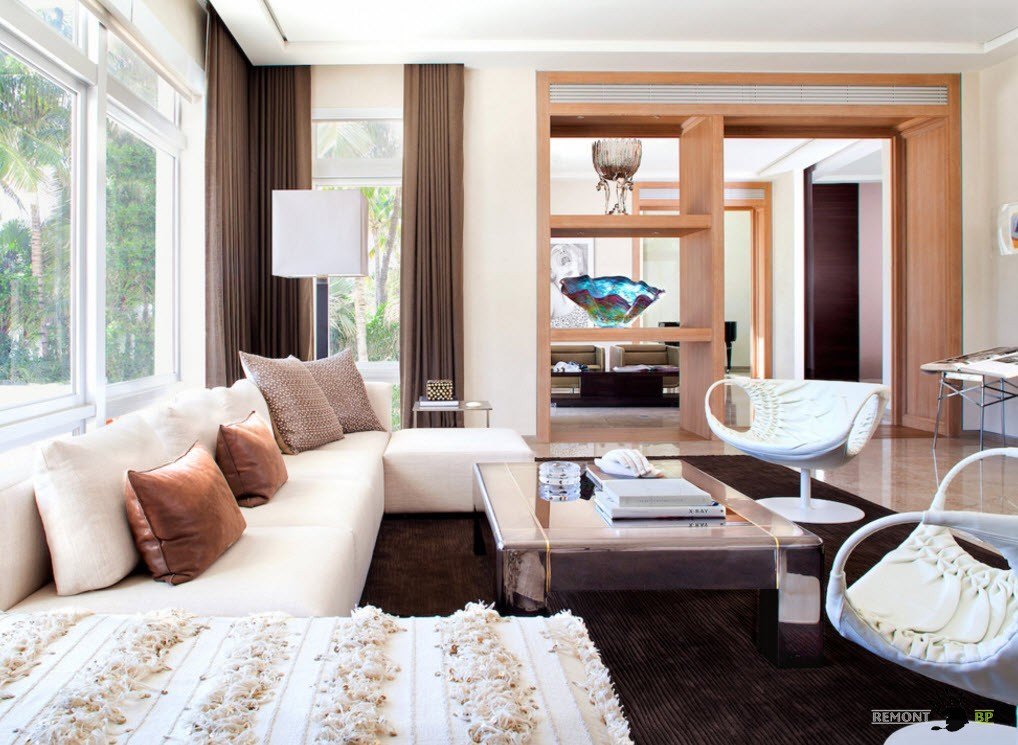Нередко в современных гостиных можно встретить большие угловые диваны белого цвета. Благодаря светлым оттенкам обивки масштабность модели не бросается в глаза. С точки зрения простоты ухода лучше отдать предпочтение кожаной обивке, если речь идет о светлой цветовой гамме мягкой мебели.