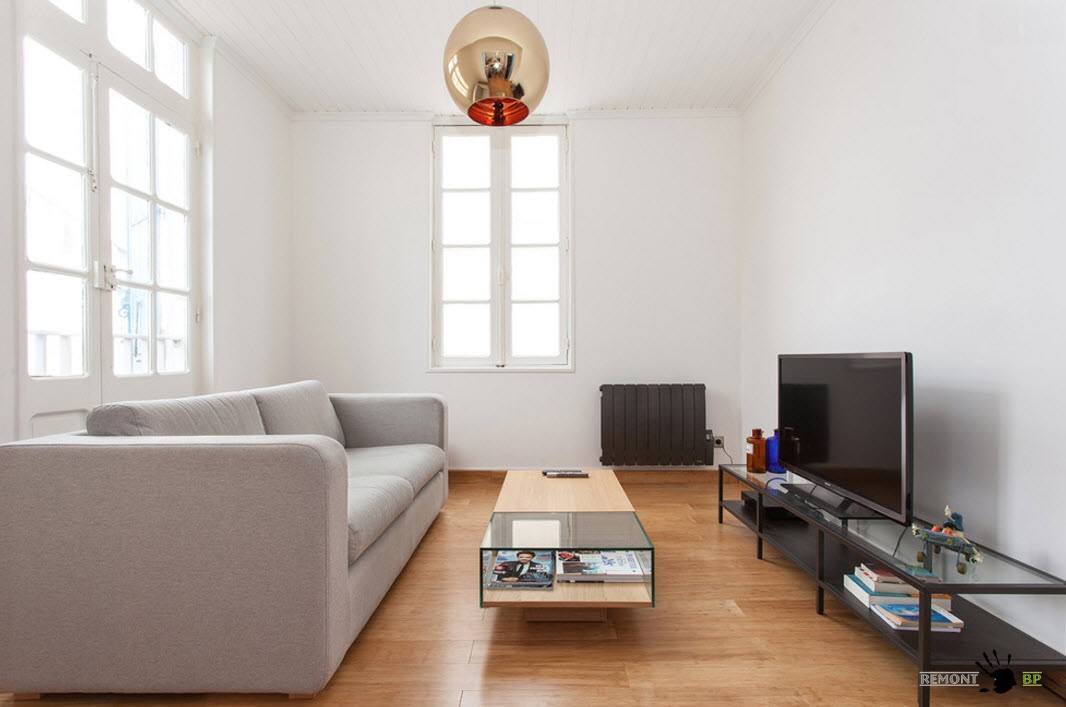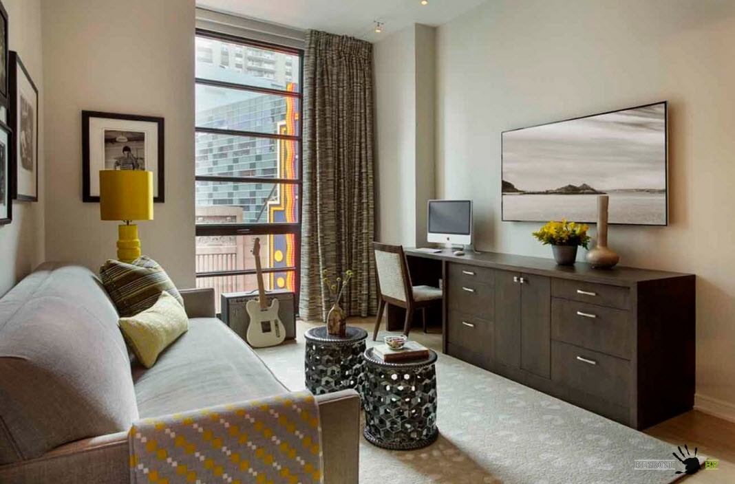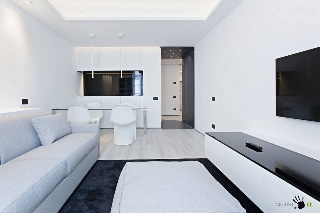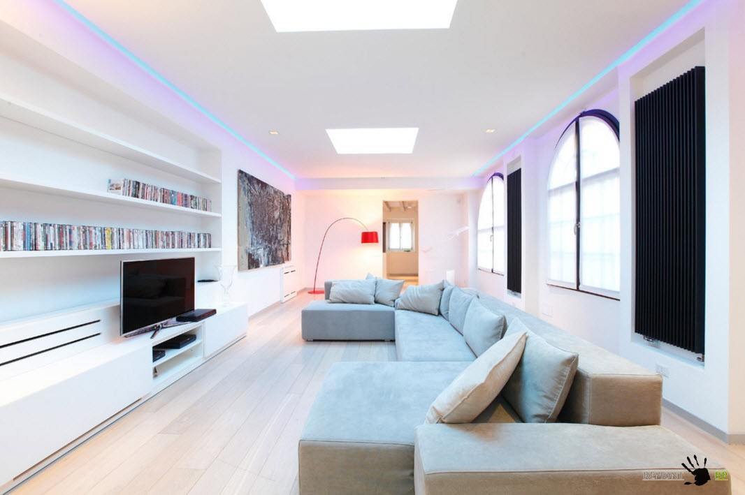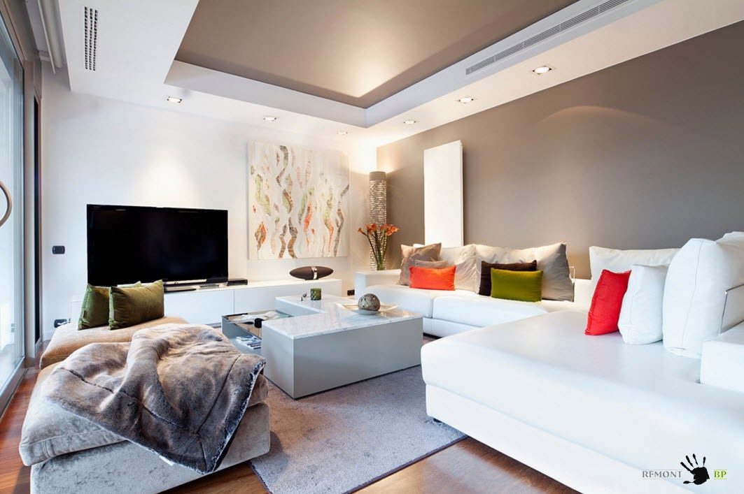 От хай-тека современной стилистке досталось использование суперпрогрессивных материалов в сочетании с минимальным декором и любовью к строгим формам. Цветовая палитра, главным образом, однотонная – белый, серый, металлик, множество зеркальных и хромированных поверхностей. Для стиля хай-тек главными персонажами интерьера всегда остаются бытовые приборы, аудио и видео техника. Если говорить о гостиной, то в альянс к огромному телевизору на стене, отлично подойдет диван-трансформер или модульные решения для организации мягкой зоны отдыха, журнальный столик на блестящих металлических ножках и со стеклянной или зеркальной столешницей. Корпусная мебель обычно представлена гладкими фасадами модульные объектов – небольших шкафчиков, которые можно распределить в пространстве произвольно или составить некую композицию в районе видео-зоны.