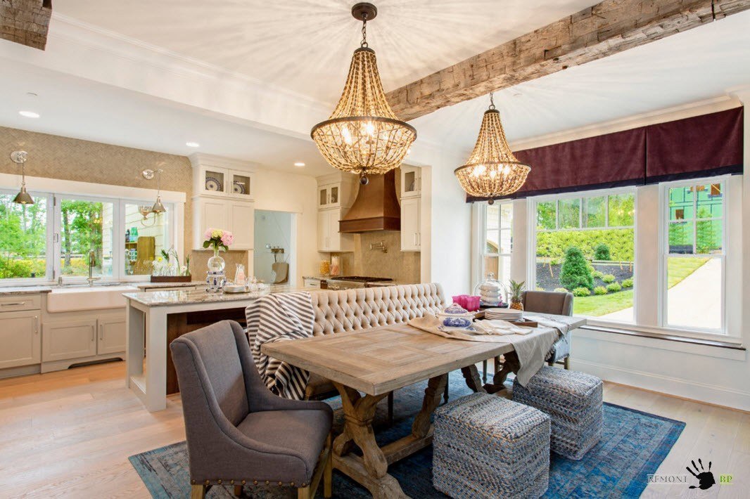 Для оформления интерьера столовой есть немало вариантов использования современного стиля в меблировки. Отголоски эко-стилистики привносят свои коррективы в формирование современного дизайна и вот мы видим в столовой деревянные стол с щербатыми поверхностями, окруженный местами для сидения в весьма эклектичной подборке.