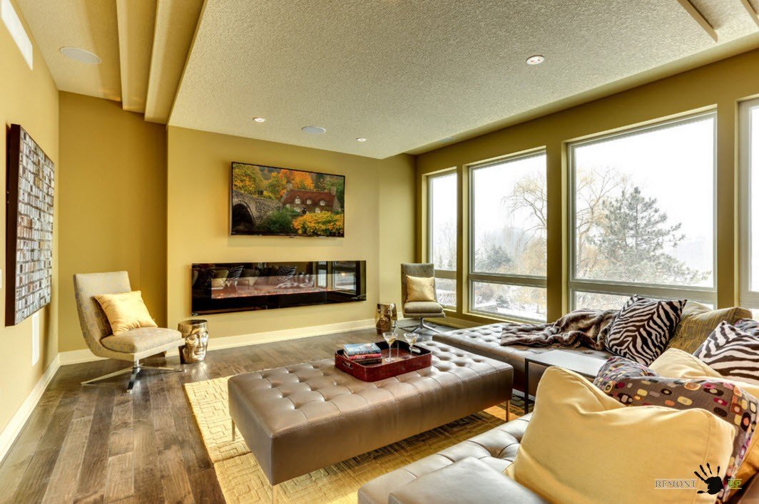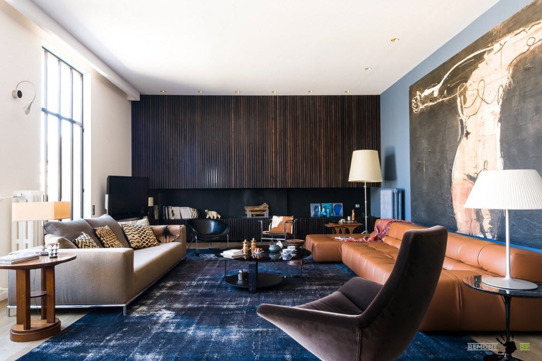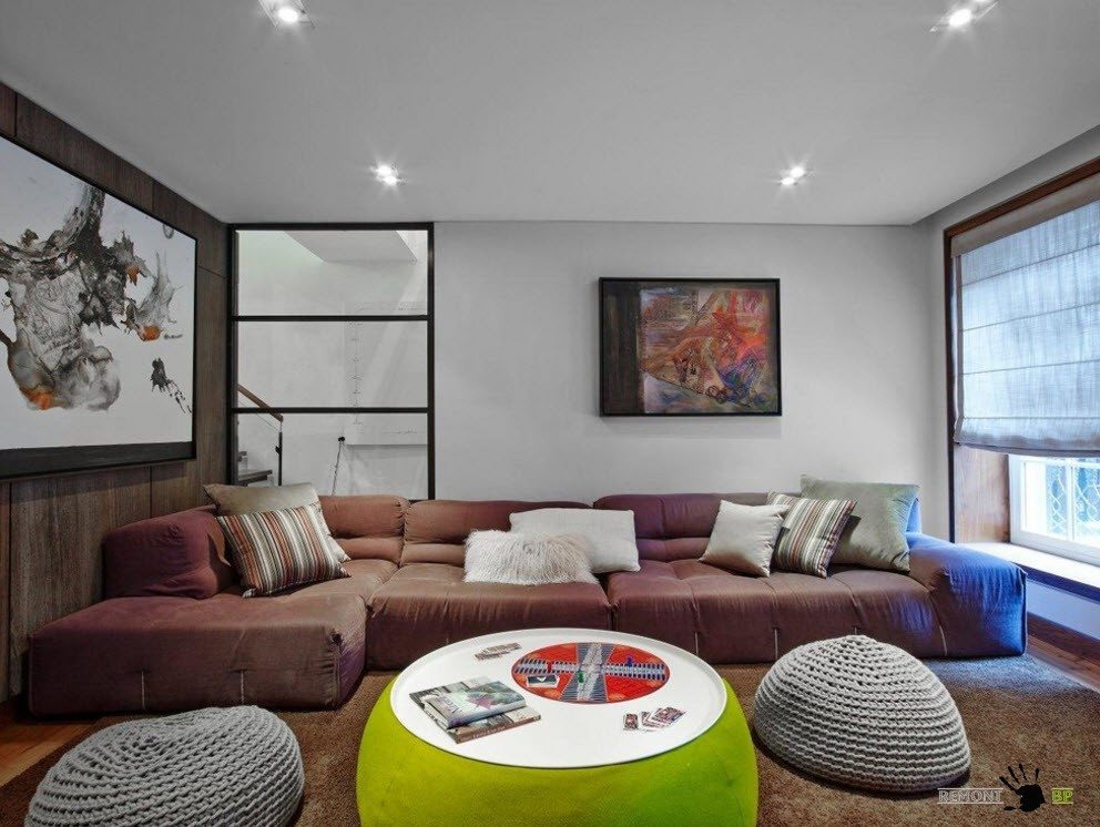 Мягкая мебель, которая буквально окутывает сидящего своим комфортом, диваны и кресла, в которые можно практически провалиться – частые элементы для создания зоны отдыха. В зависимости от выбранной палитры отделки гостиной, такая меблировка может быть светлой, нейтральной (если расположена на фоне акцентной, яркой стены) или наоборот выступать в качестве колоритного фокусного центра помещения и иметь очень яркую обивку.