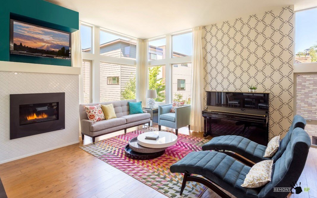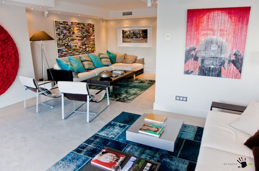 Как правило, для оформления мягкой зоны современной гостиной, используется меблировка в светлых, нейтральных тонах, с обивкой без принтов и орнаментов. Но для придания цветового разнообразия и позитивного настроения интерьера со светлой отделкой, отлично подойдет яркая, колоритная мебель. Она прекрасно будет выполнять свои основные функции и при этом может стать изюминкой дизайна.