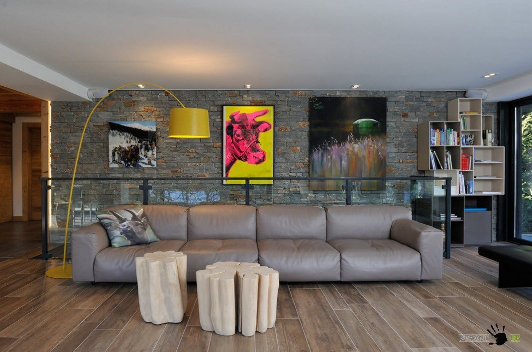 Часто в современной гостиной в качестве острова выступает не традиционный для большинства дизайнеров и домовладельце журнальный столик, а некий микс большой подставки и мягкого пуфа. Как правило, такие модели выполняются с кожаной обивкой, но может встречаться и использование других видов материалов.