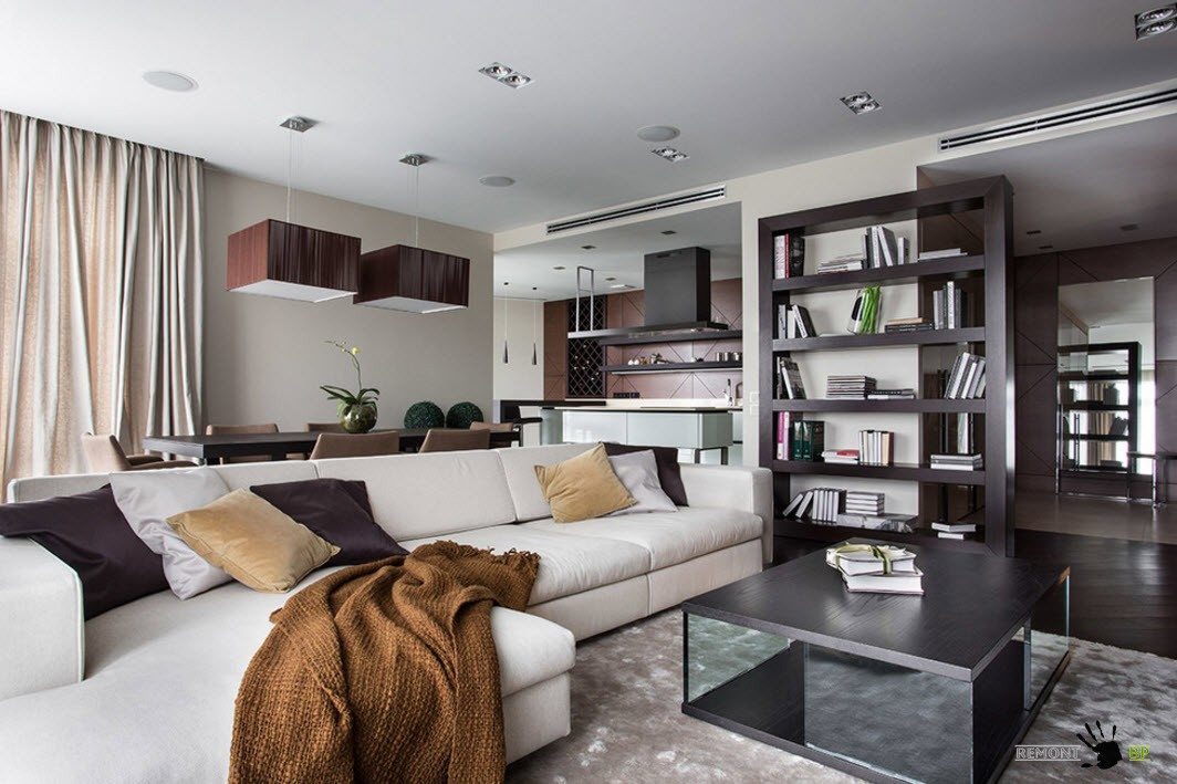 В современных интерьерах часто можно встретить использование систем хранения в качестве межкомнатных перегородок. Книжные стеллажи или просто открытые полки могут крепиться к компактным перегородкам-ширмам. Также, из отдельных модулей-шкафов небольших размеров может составляться композиция, которая зонирует пространство.