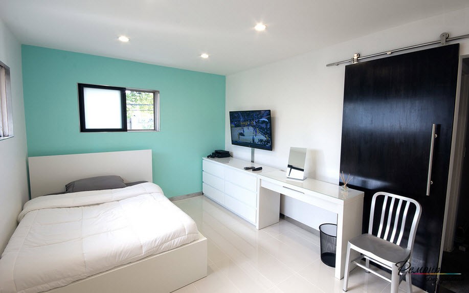 Как и в любом другом стиле, мебель располагается воль стен. Шкафы могут быть как приставными, так и встроенными. Присутствие комода не всегда возможно из-за малых размеров спальной комнаты.