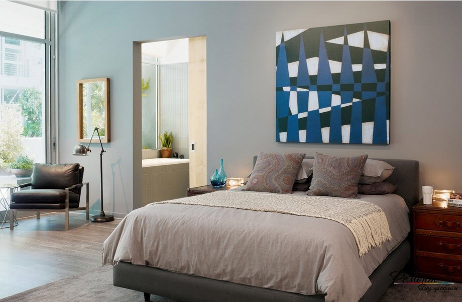 Главный атрибут спальни, кровать, должна быть широкой, достаточно мягкой и удобной, цвет постельного текстиля должен гармонировать с окружающим пространством.