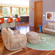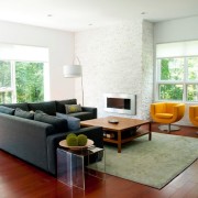 Имеется и другой вариант – функциональная мебель для гостиной с оборудованным рабочим местом с компьютером, которое также скрыто за дверцами. По такому принципу мебель может скрывать целое спальное место или, к примеру, откидную столешницу. Что касается диванов и кресел, здесь могут быть такие варианты: или идеально ровные геометрические формы, или полукруглые. Кстати, очень часто диван или кресла служат ярким акцентом всего интерьера, в связи с чем, их цвет может быть даже ярко-красным или зеленым.