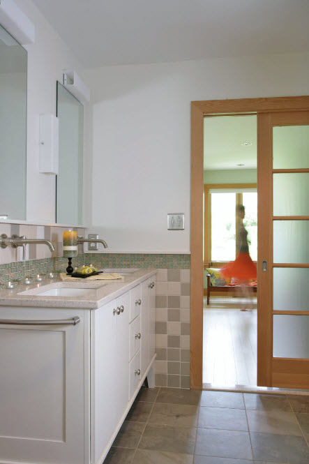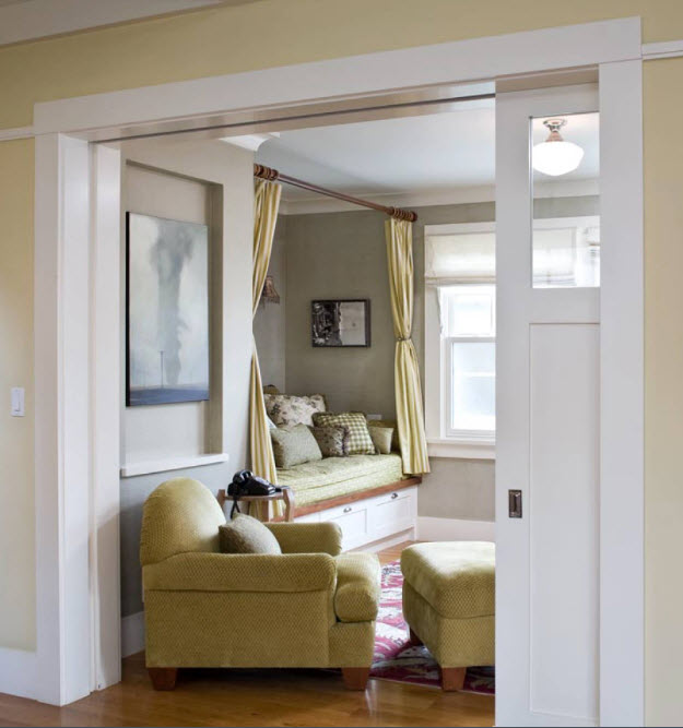 Согласитесь, что распашная дверь в открытом состоянии занимает немало полезного пространства комнаты, да и на само открывание необходим определенный запас площади. В малогабаритных помещениях дизайнеры предлагают использовать вариации раздвижных дверей. Первый способ создания такой конструкции – размещение дверного полотна между двух рельс, которые крепятся к потолку и полу. В результате мы получаем раздвижное полотно, действующее по принципу дверей в купе. В последнее время этот способ создания изолированности помещения упростили до одной подвесной рельсы или штатива, который крепится к стенам над дверным проемом. Таким образом, можно экономить пространство небольших помещений, но важно понимать, что вплотную к стене в месте перемещения дверного полотна мебель или другие предметы интерьера установить нельзя будет.