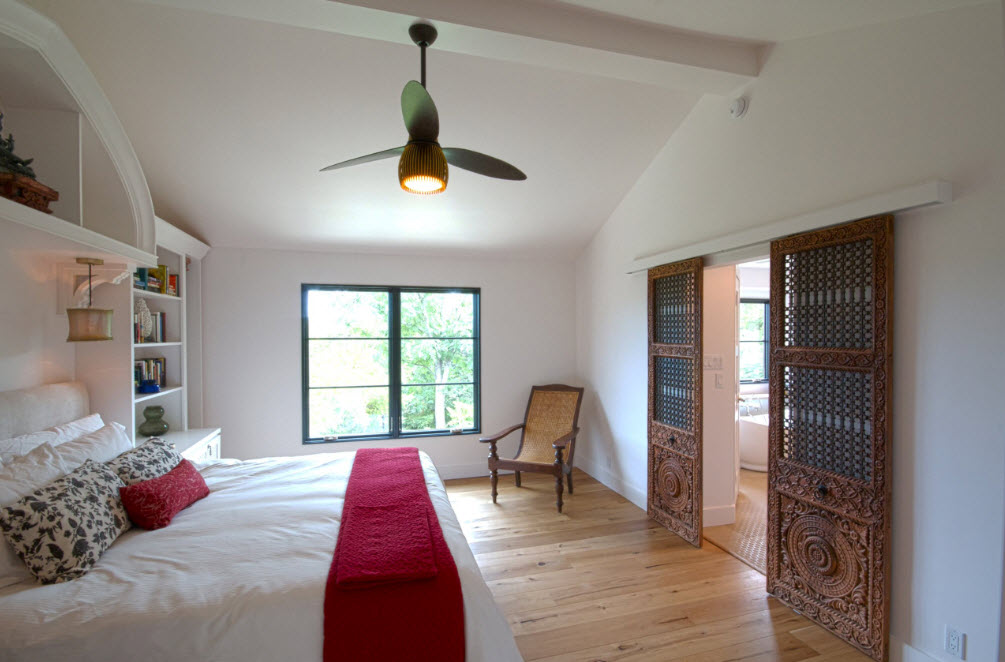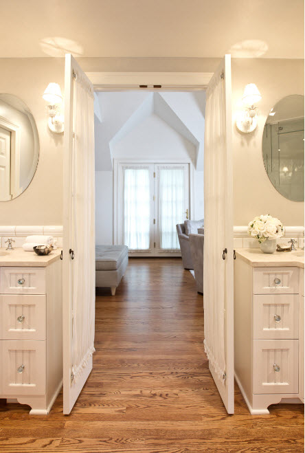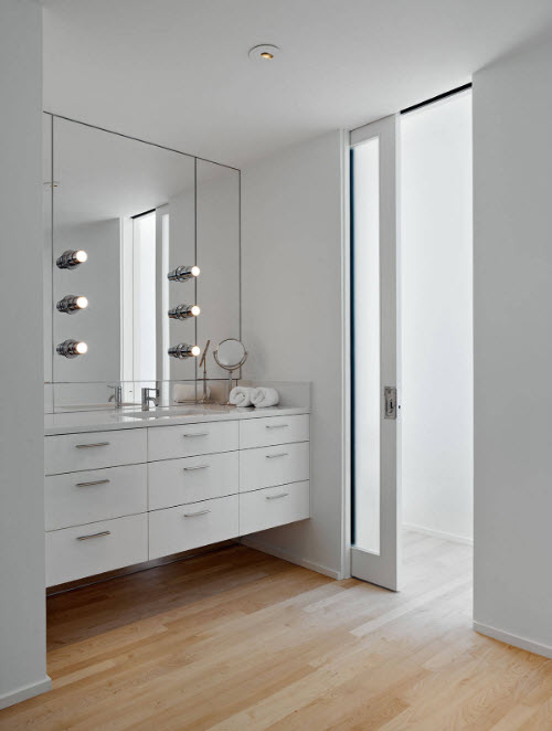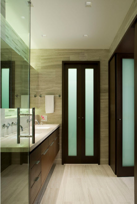 Дизайнерский прием, при котором двери в комнате выглядят в точности так же как и фасады шкафов или гардеробной зоны позволяет достичь создания гармоничного образа помещения. Двери комнаты и шкафа могут отличаться габаритами, но стилистическое исполнение и цветовой выбор должны совпадать.