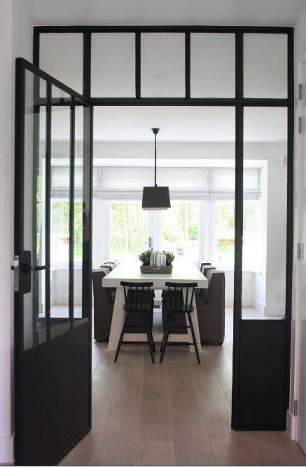 Все эти варианты дверей, выполненных из различных материалов, могут быть представлены как в глухом виде (филенка), так и со стеклянными вставками. К слову о стекле, как материале для исполнения дверных полотен. В современных дизайн-проектах все чаще можно встретить двери, выполненные исключительно из стекла, без рамок и профилей. Такие конструкции смотрятся легко и свежо, привносят в интерьер не только мотивы индустриальности, технологичности, но и возможность визуального расширения пространства. Двери из каленого, безопасного для человека стекла (даже если такое полотно разбивается, чего непросто добиться, человек не сможет пораниться осколками из-за защитной весьма прочной пленки) практически не препятствуют проникновению света, что позволяет сохранять иллюзию простора даже при изоляции помещений.