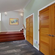 Для целостности восприятия помещения все двери, которые выходят в один холл, должны быть одинаковыми, даже если планируется устанавливать разные конструкции дверных систем. И именно дизайн этой комнаты, где все двери видны как на ладони, должны задавать им и тон и стиль.