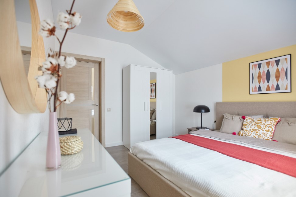 - Не стоит забывать про охровые цвета и оттенки. Чтобы сделать минимализм более «живым», можно спокойные молочные тона разбавить ярким оттенком охры, бирюзы или даже розового. На белую, молочную или кофейную постель можно уложить яркие подушки.