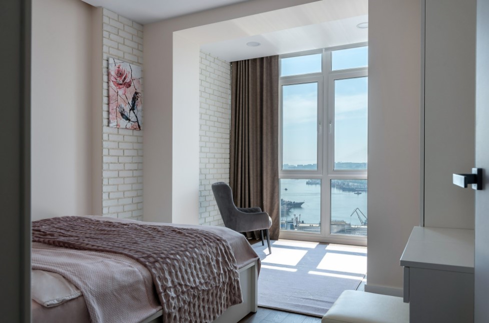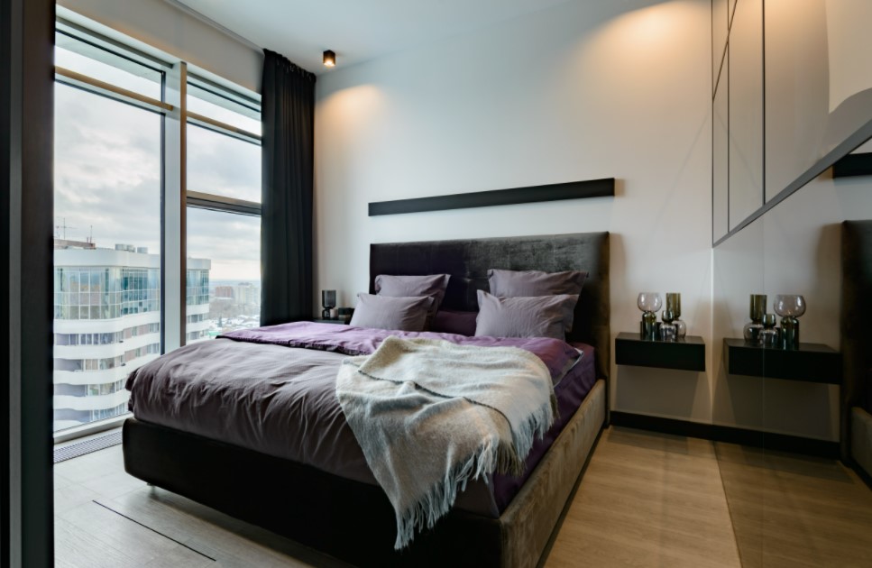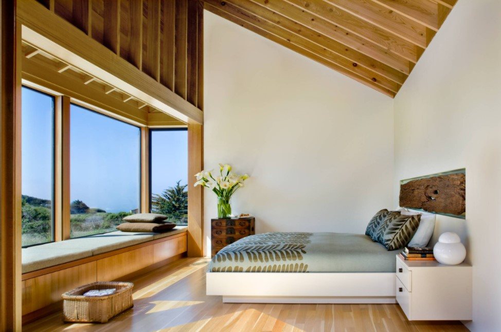 - Красиво будут смотреться в минималистичной спальне окна по типу панорамы. Не все такое любят, но смотрятся они очень эффектно, а еще дают самое главное – естественное правильное освещение.