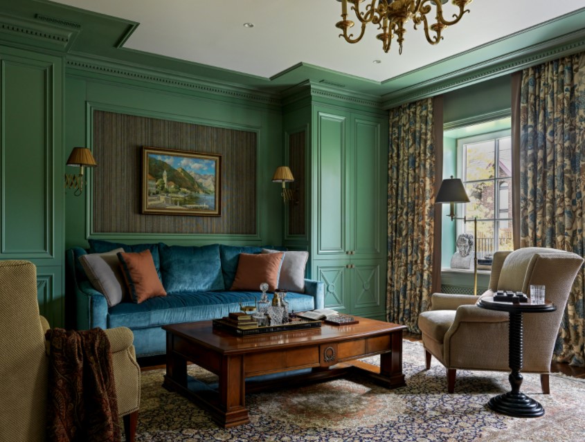 - обивка в умеренных расцветках, старинных узорах и принтах,