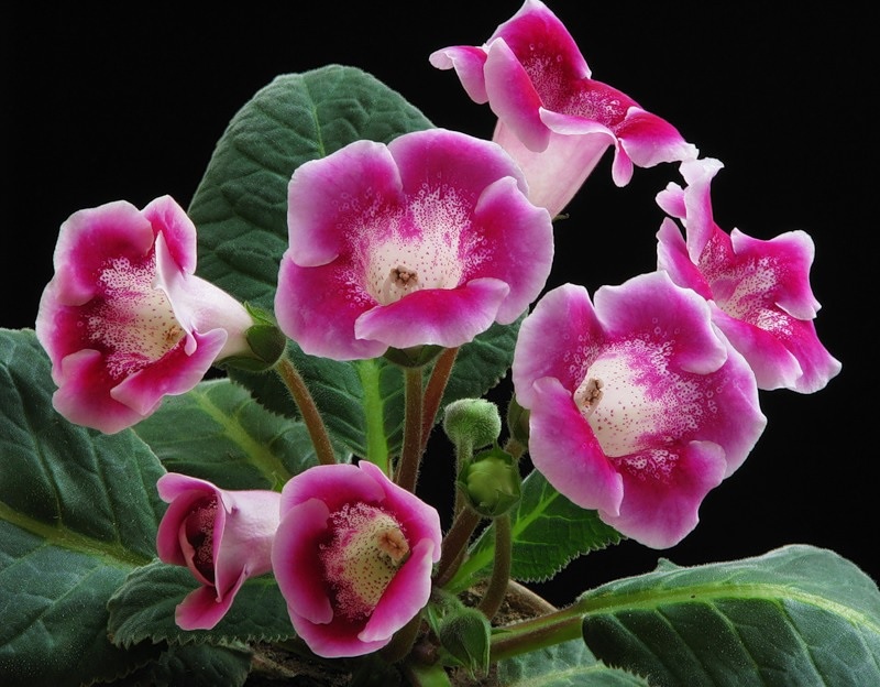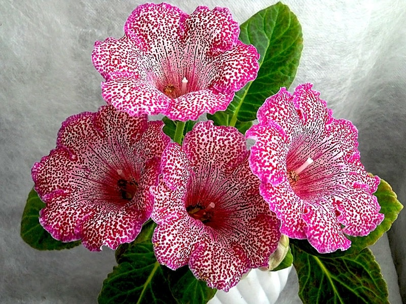 Сорт глоксиния прекрасная «Gloxinia speciosa» также снабжена овальными листьями. Они имеют ярко-зеленый цвет и растут на длинных черенках. Цветки этого растения могут иметь разнообразную форму в зависимости от разновидности.