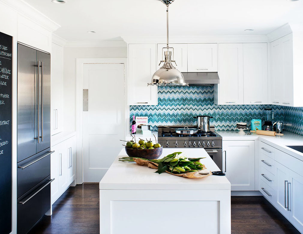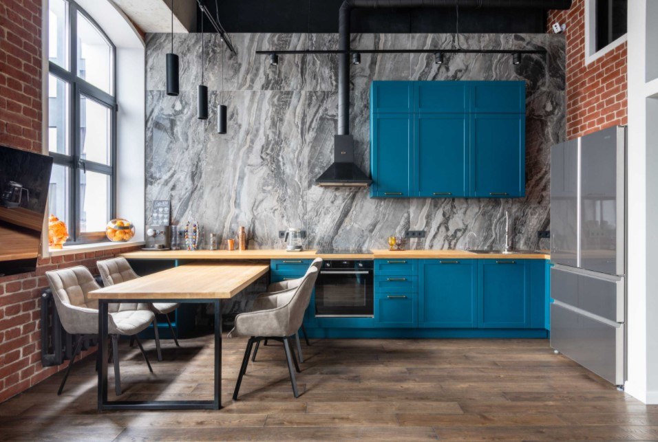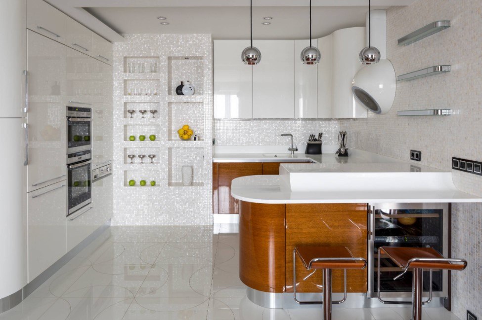 Благодаря возможностям новых технологий производители предлагают, как классические черные, белые, песочные и серые варианты, так и цветные решения, стилизованные под окрас драгоценных камней: пурпурный аметист, глубокий мрамор, ультрамариновый лазурит, амазонит. Однако при таком оформлении поверхностей мебель следует выбирать нейтральную.