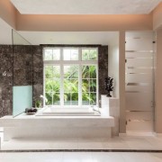 Комбинирование плитки, имитирующей разные виды каменных поверхностей, создает оригинальный и при этом элегантный дизайн ванной комнаты. Роскошь присутствия природного материала (или эго удачной имитации) преображает весь образ утилитарного помещения.