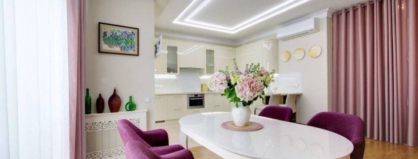 Одни из самых просторных помещений в доме или квартире обычно отводится на гостиную комнату. Именно поэтому потолки могут быть самыми разными и интересными. Если потолки в вашем помещении низкие – советуем остановится на классических вариантах покрытия. К примеру, можно выполнить окрашивание потолка с использование плавного градиента. Потолки, которые выполнены в венецианской технике с использованием штукатурки, выглядят эффектно и хорошо вписываются во многие стили, включая классический.