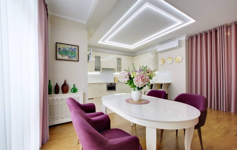 При высоких потолках вы можете использовать самые разные виды подвесных, комбинированных и натяжных конструкций, экспериментировать с подсветкой и освещением. А придать более современного вида помещению могут многоуровневые гипсокартонные конструкции в комбинации с натяжными полотнами и зеркальными вставками. А кассетные разновидности подчеркнут любой современный стиль.