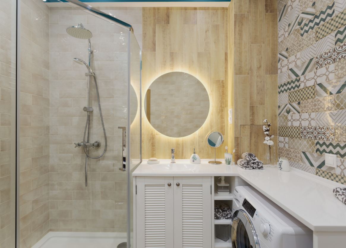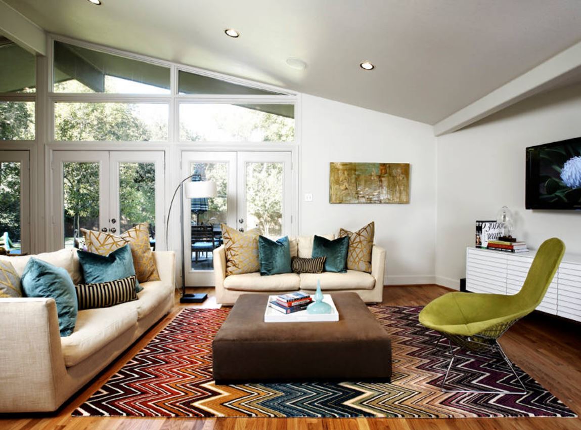 Принтованное оформление напольной плитки или ковра предполагает стены в нейтральных цветах. А помимо выраженных узоров разнообразить помещение возможно разными текстурами и материалами: дерево, мех, камень, лен, мешковина, кирпич, стекло и другое.