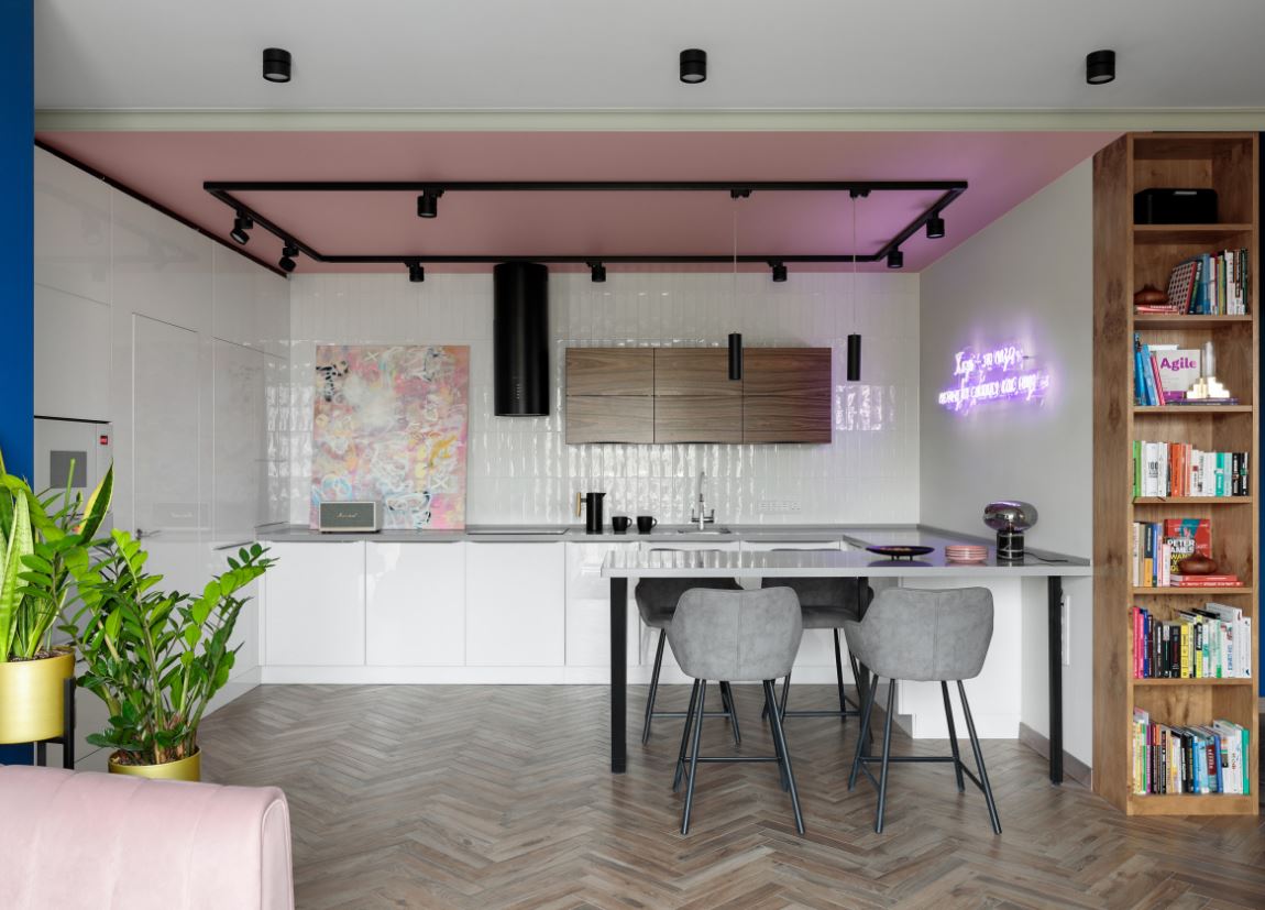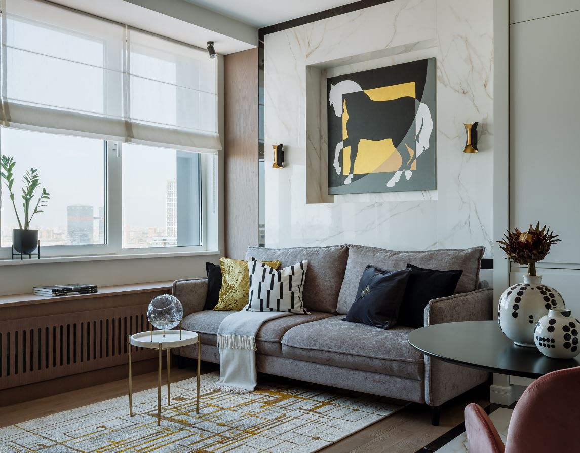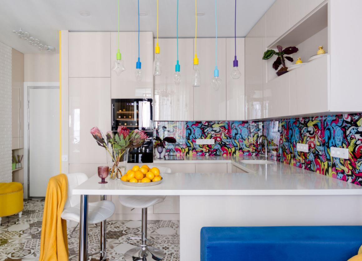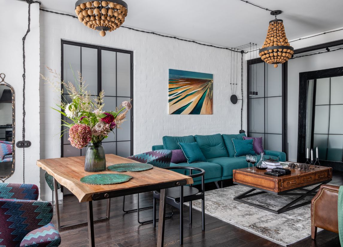 - лофт и минимализм допустимо дополнить геометрическим узором, абстракцией и цветами.