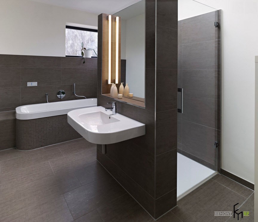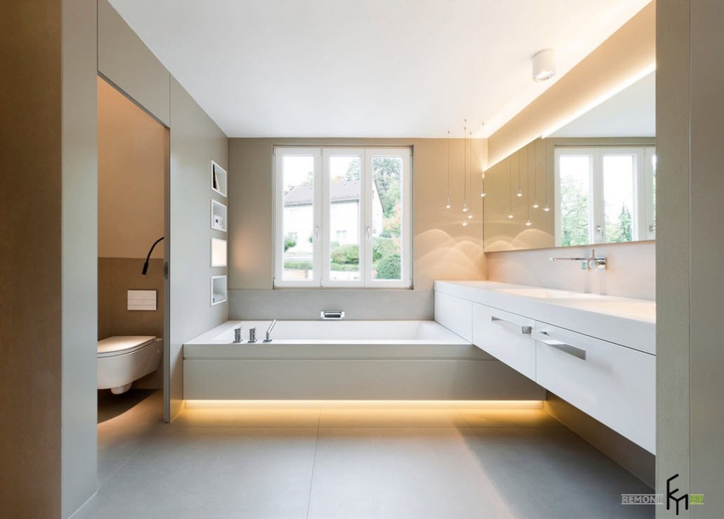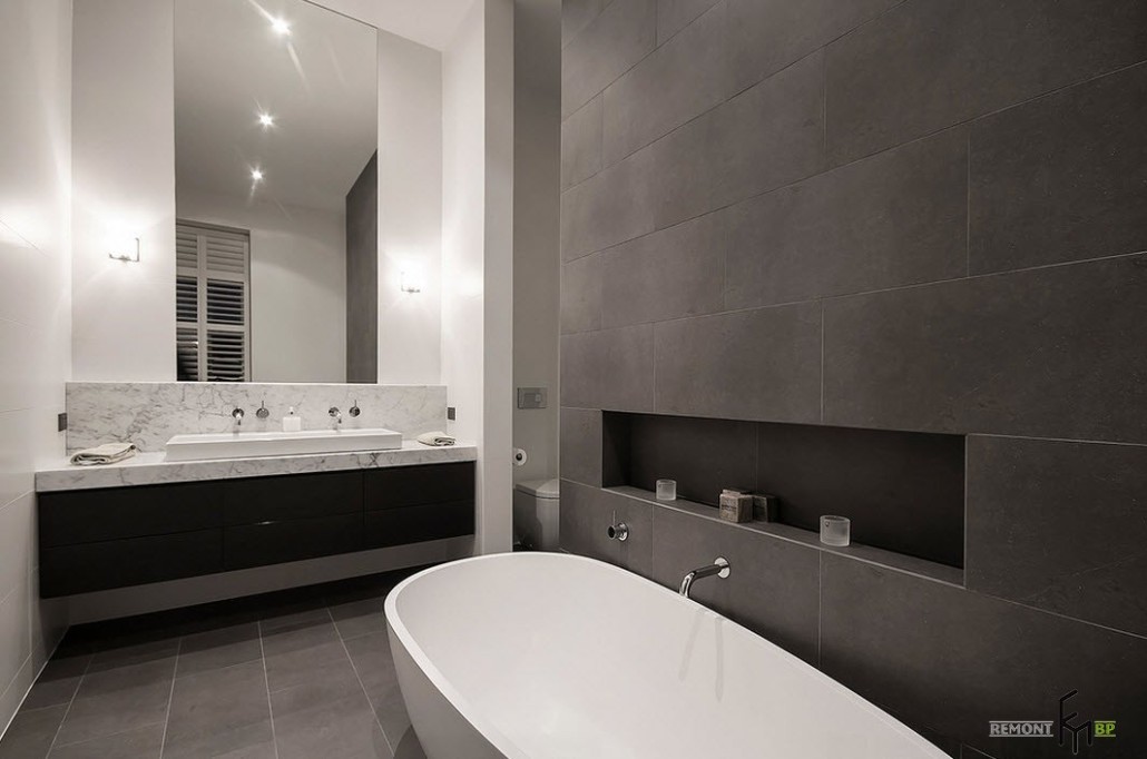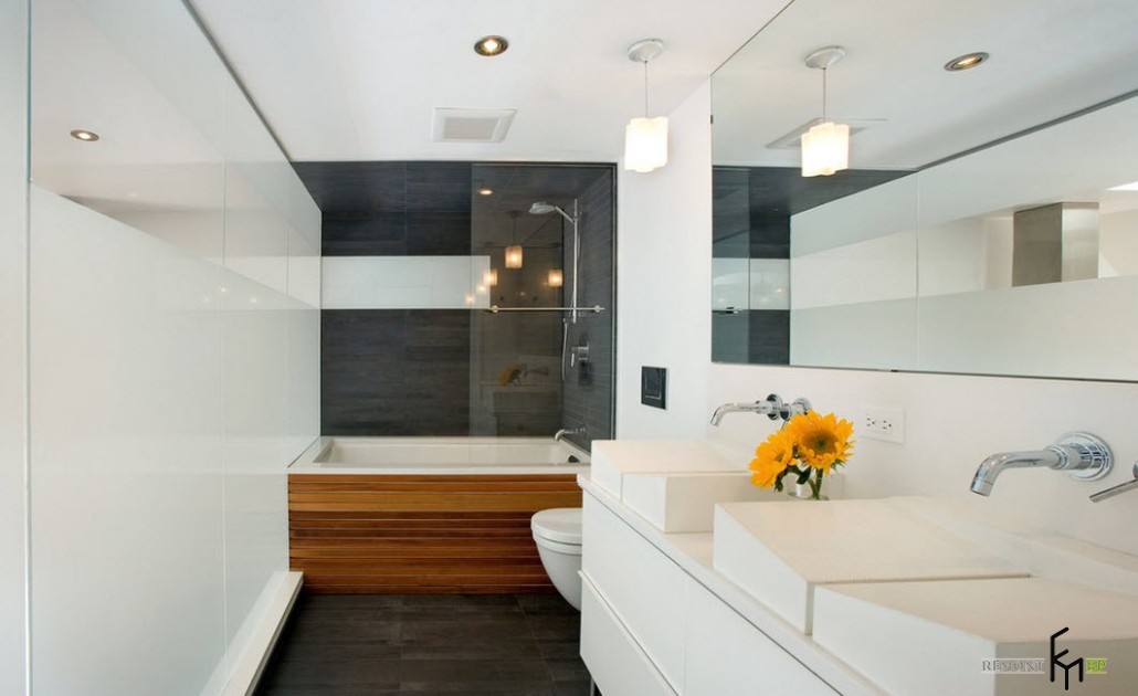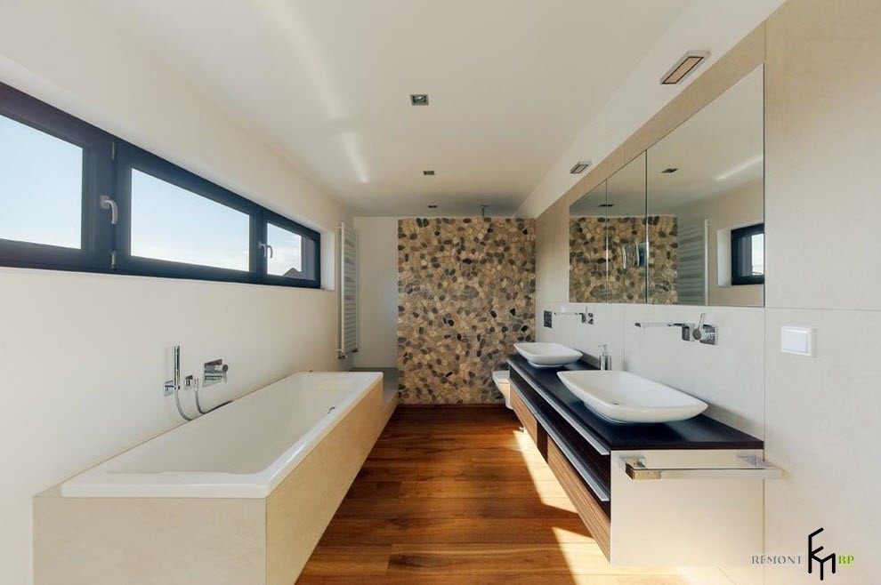 Следующей особенностью ванной сегодня является то, что конструктивно она будет встроена в, своего рода, подиум, при этом, «конструкция» может занимать большую часть или даже всю длину стены.