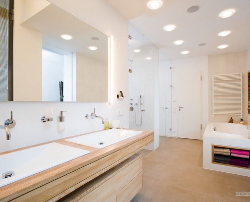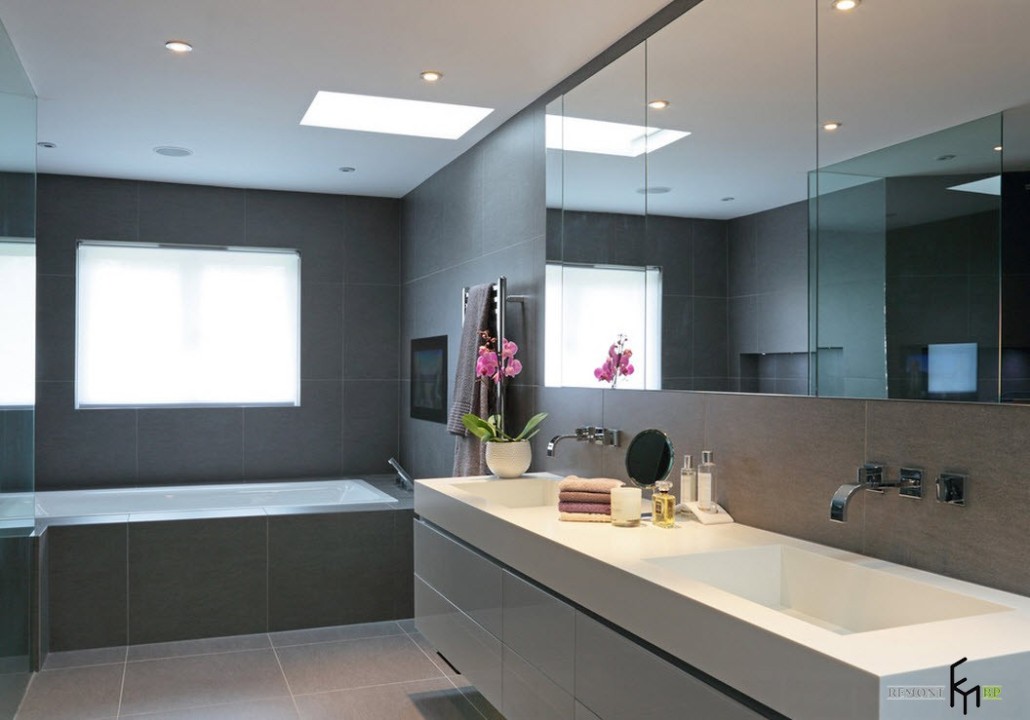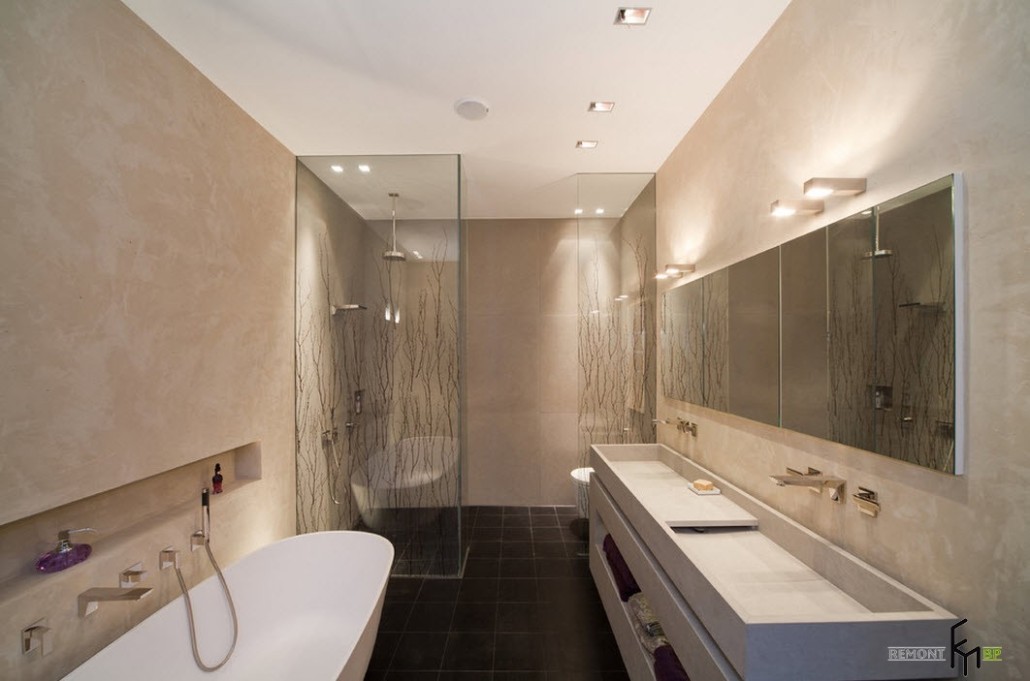 Прекрасным декором современной ванной комнаты может служить оригинально оформленное освещение, включая подсветку.