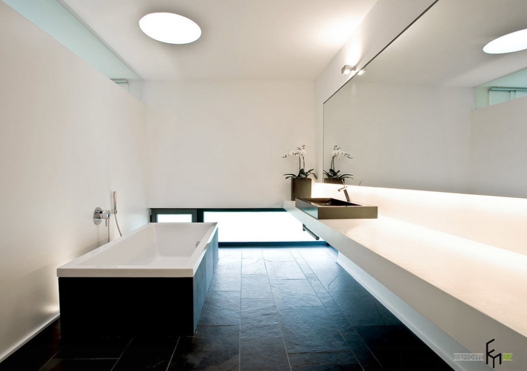 Сегодня ванная комната немыслима без встроенной подсветки. Ею можно оборудовать не только зеркала, но и саму ванную, что, согласитесь, будет прекрасно смотреться в затемненной комнате, когда вам абсолютно не требуется яркое освещение. Освещение всей комнаты может быть организовано точечными светильниками, встроенными в потолок, или современными оригинальной конструкции подвесными светильниками. Здесь также должно соблюдаться лаконичность форм.
