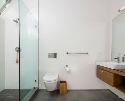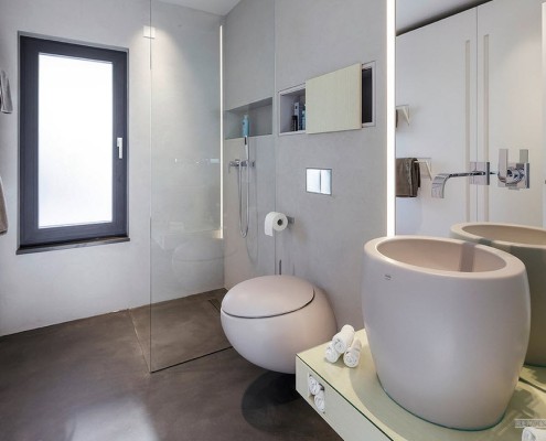 Претерпели аналогичные изменения и раковины с унитазами. Форма их будет прямоугольной, цвет белый. Конструктивно они будут выполняться отдельно от туалетной тумбочки, вне ее конструкции. Тумбочки будут оригинального исполнения, конструкция подвесная. Унитазы тоже будут подвесные. Все коммуникации будут встроены в стены.