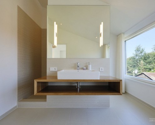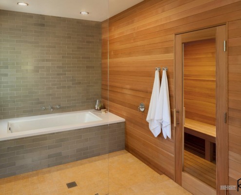 Ванная комната, особенно, если в ней имеется парилка, должна излучать тепло, не только физическое, но и эмоциональное. Как раз этому и будут способствовать поверхности, облицованные деревом или любым другим материалом, имеющим цвет и структуру дерева.