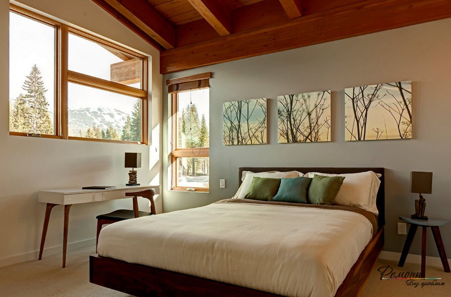 - Для спальни лучше всего выбирать спокойные краски. Уместными здесь будут нежные цветы, лирические портреты или пейзажи в пастельных тонах. Именно такие картины будут способствовать полному расслаблению после напряженного рабочего дня.