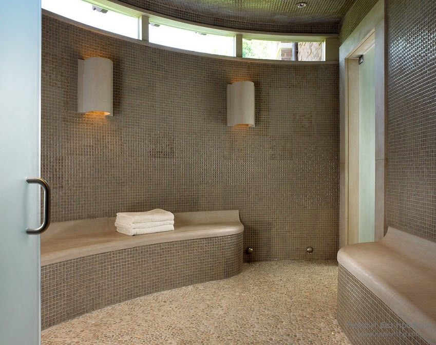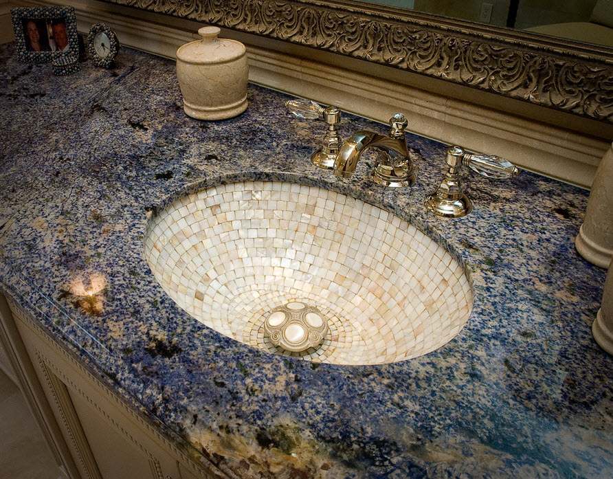 - Каменная мозаика считается элитным материалом. Ее самая известная разновидность – мраморная. Так же используют яшму, лазурит, травертин и другие полудрагоценные и поделочные камни. С ее помощью украшаются стены, полы, барные стойки, столешницы, ванные и бассейны. Эффектно смотрятся лестницы и холлы в общественных учреждениях с оформлением из каменной мозаики. Не редко ее применяют и при внешней отделке фасадов, входов, даже обустройстве дорожек.