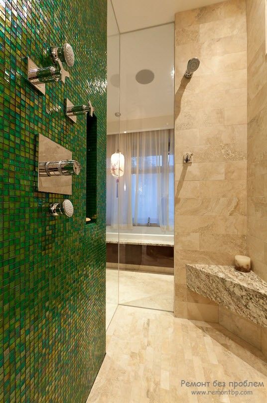 - Стеклянная мозаика является самым популярным видом при отделке поверхности. Стоимость ее не велика, зато исполнение может быть самым разнообразным: матовым, прозрачным, с декоративными включениями, золотым или платиновым, благодаря соответствующему слою фольги. Применение обусловлено свойствами материала: устойчива к длительному воздействию воды, солнечному свету, перепадам температуры и моющим средствам, прочная, жаростойкая. морозостойкая. С ее помощью происходит отделка ванных комнат и бассейнов, кухонных фартуков и столешниц, прозрачных комнатных перегородок и стен, полов и каминов, предметов мебели.