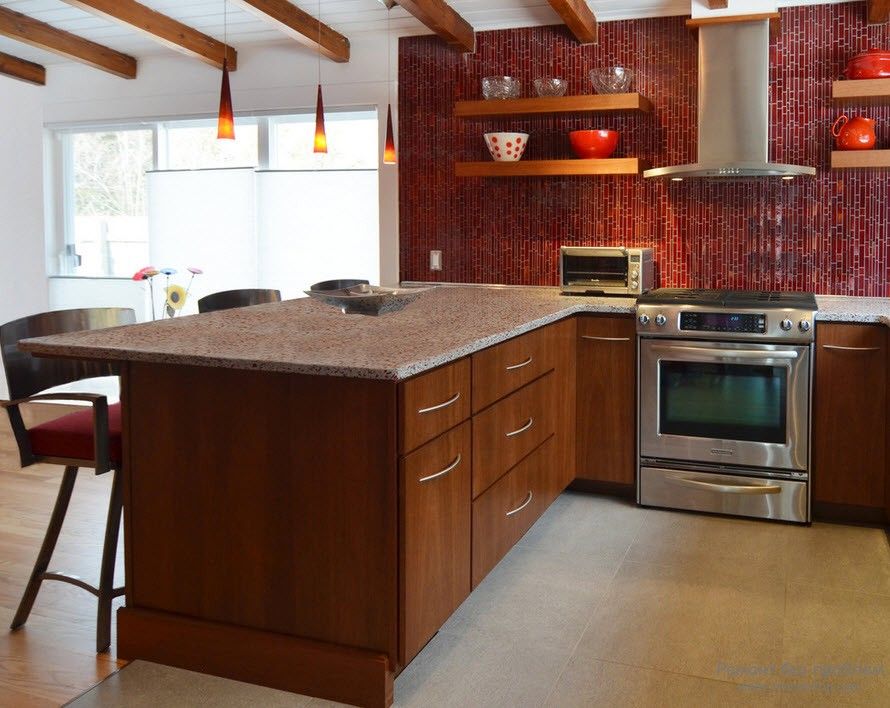 - Мозаика из смальты является эксклюзивным вариантом. Один из самых дорогих и практичных материалов. По внешнему виду она напоминает стеклянную, но с очень гладкой поверхностью. Цвет изделий очень яркий, насыщенный и глубокий. Благодаря инновационным технологиям, создаются тысячи оттенков с эффектом свечения. Она пригодна для украшения любых поверхностей, в том числе в местах с постоянной нагрузкой – пол на кухне или в коридоре.
