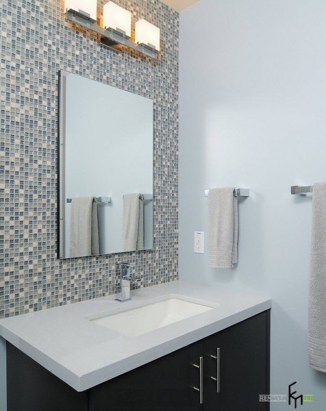 Небольшой отрезок поверхности над рабочей зоной раковины, облицованный с помощью яркой глянцевой мозаики, не только привнес цветовое разнообразие в нейтральную палитру ванной комнаты, но и оживил интерьер.