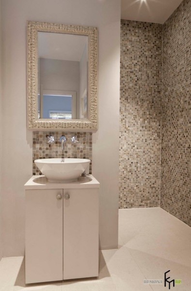 Рассмотрим на конкретных дизайн-проектах ванных комнат и санузлов, каким образом можно применить мозаику для облицовки тех или иных поверхностей, выделения акцентов, декорирования сантехники и предметов мебели, отделки сложных геометрических форм.