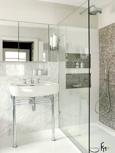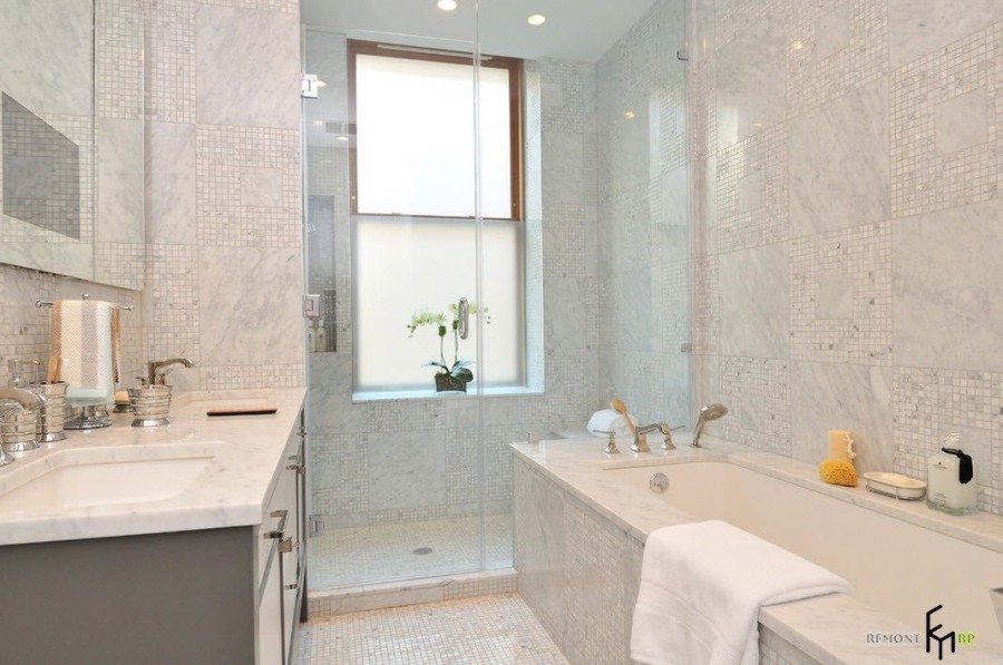 Среди светлой палитры мозаичной плитки, особенно хотелось бы выделить мраморную отделку. Даже небольшие включения мраморной мозаики в интерьер привносят атмосферу роскоши, наполненной чистотой и даже стерильностью утилитарного помещения.